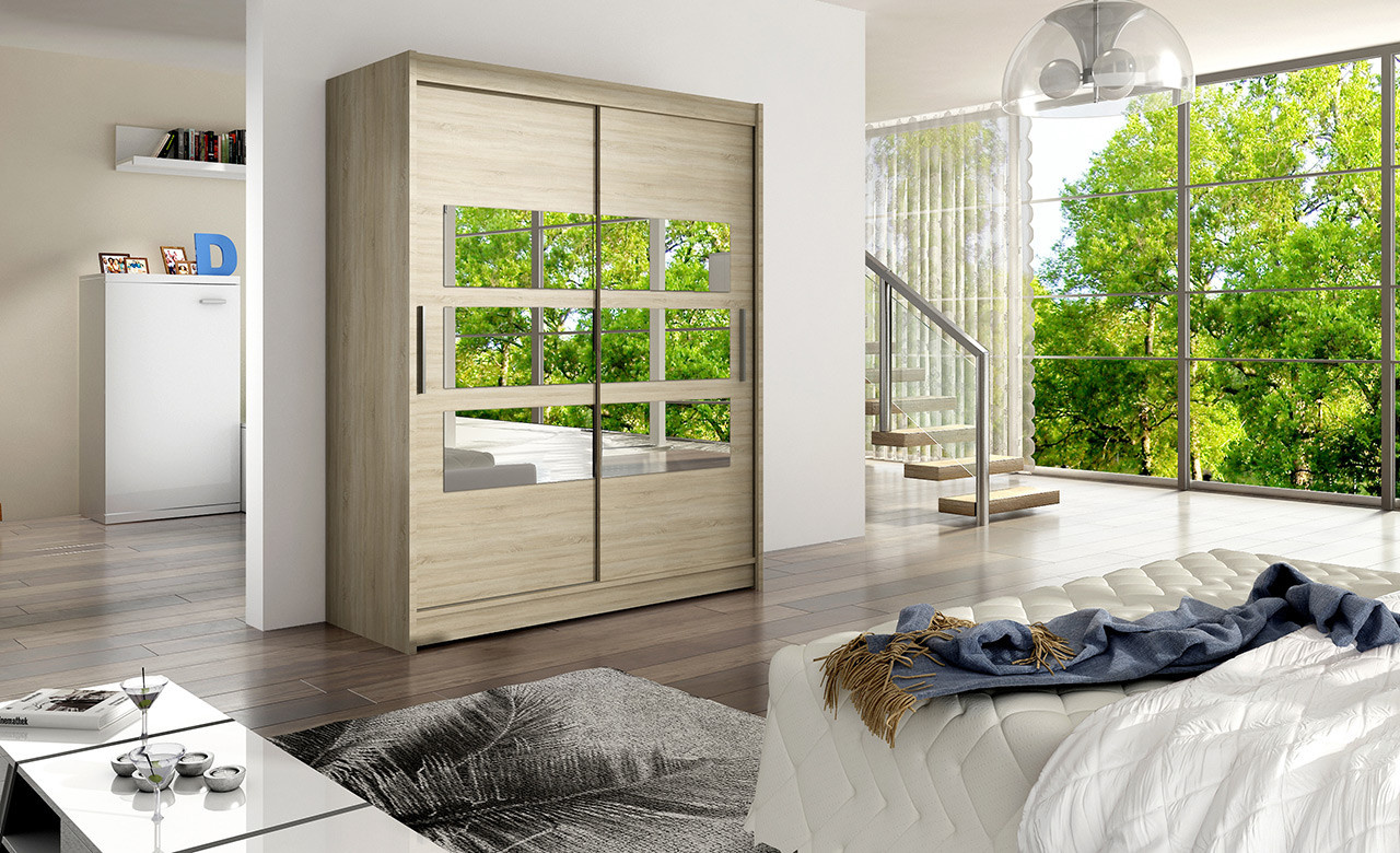 Jednoduchý a elegantní design skříně osloví i náročné zákazníky. Eleganci podtrhují dlouhé stříbrné úchyty a zrcadla, která jsou nalepena na dveřích skříně. Je vyrobena z lamina o síle 16 mm a hrany jsou ukončeny ABS lištou. Vodící lišty jsou vyrobeny z odolného hliníku a splňují požadavky pro každodenní užívání. Díky svému uspořádání poskytuje dostatek úložného prostoru a zrcadlo prostor opticky zvětší a prosvětlí. Skvěle se hodí do ložnice, předsíně, dětského, nebo studentského pokoje. Skříň je dodávána v demontu a součástí je montážní plánek včetně všech potřebných spojovacích materiálů. Vyobrazené dekorace nejsou v ceně.