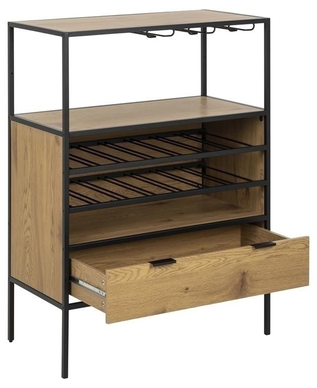 A Seaford borhűtő szekrény a kollekció egyik legújabb eleme. A borospoharak és palackok praktikus tárolási lehetőségének köszönhetően ez nagyszerű választás lesz minden borkedvelő számára. Helyezd el a harapnivalókat a munkalapra, és tedd a konyhai eszközöket a fiókba - rengeteg hely van ott. A fém és a vad tölgy színű furnér kombinációja csodálatos, ipari jelleget kölcsönöz neki, amely kiemeli minden modern otthon dekorációját. Főbb jellemzők: Modern szekrény vad tölgy színű furnérral borítva Fekete, porszórt fém keret Palacktartó és pohártartó Polc és fiók tároláshoz Dán dizájn, kizárólag az Actonának védett Kartonok száma: 1 Kartonok méretei: 113x46x14,5 cm Kartonok súlya: 24 kg