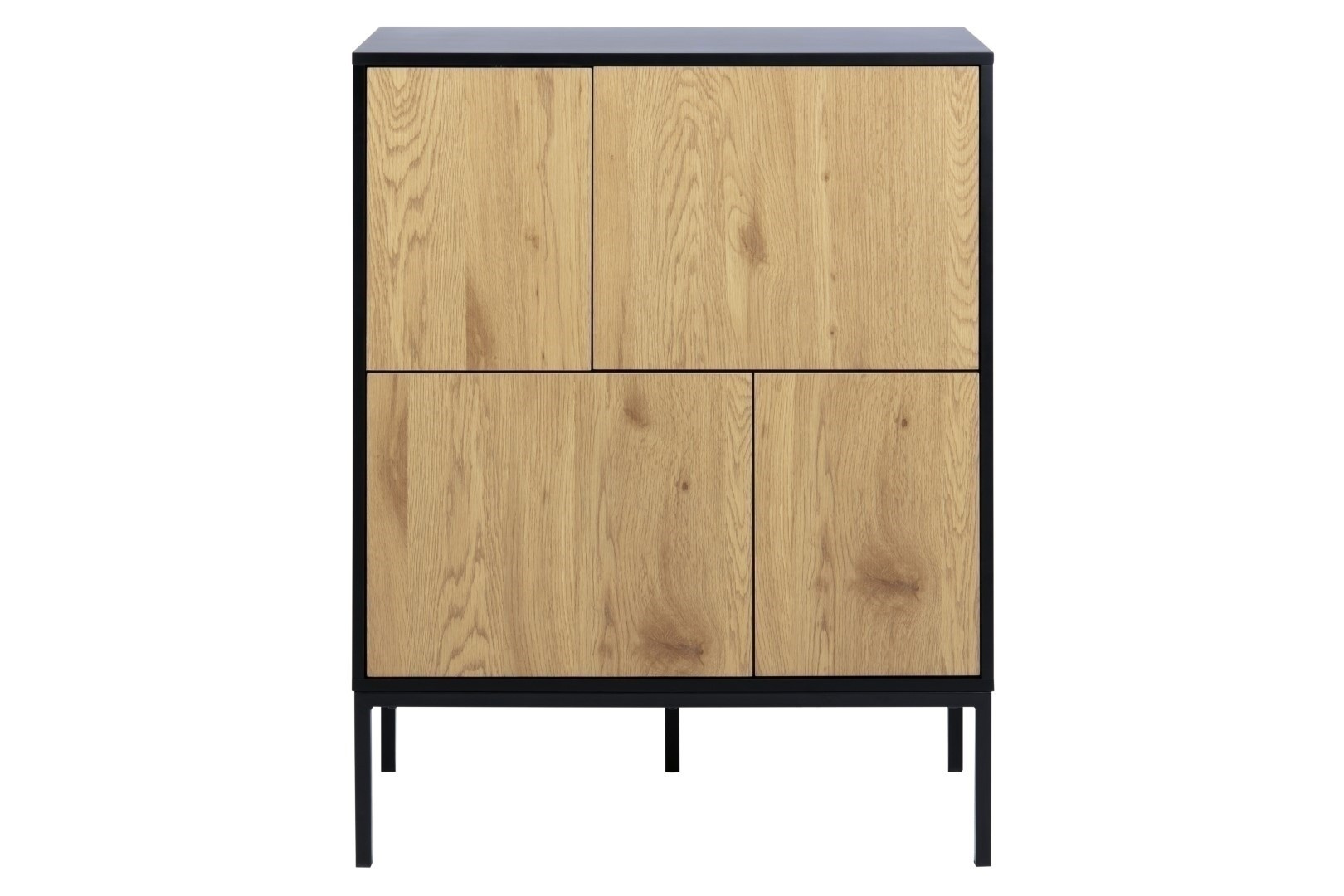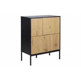 A Seaford komód a Seaford ipari kollekció további bútordarabja. A komód, amely négy tágas, ajtós szekrényből áll, négy fekete matt lábon állt. A komódák elülső részei MDF-ből készültek, természetes tölgy textúrájú furnérral. Tömeg: 30 kg. Kartondoboz méretei: 47cm x 89cm x 23cm