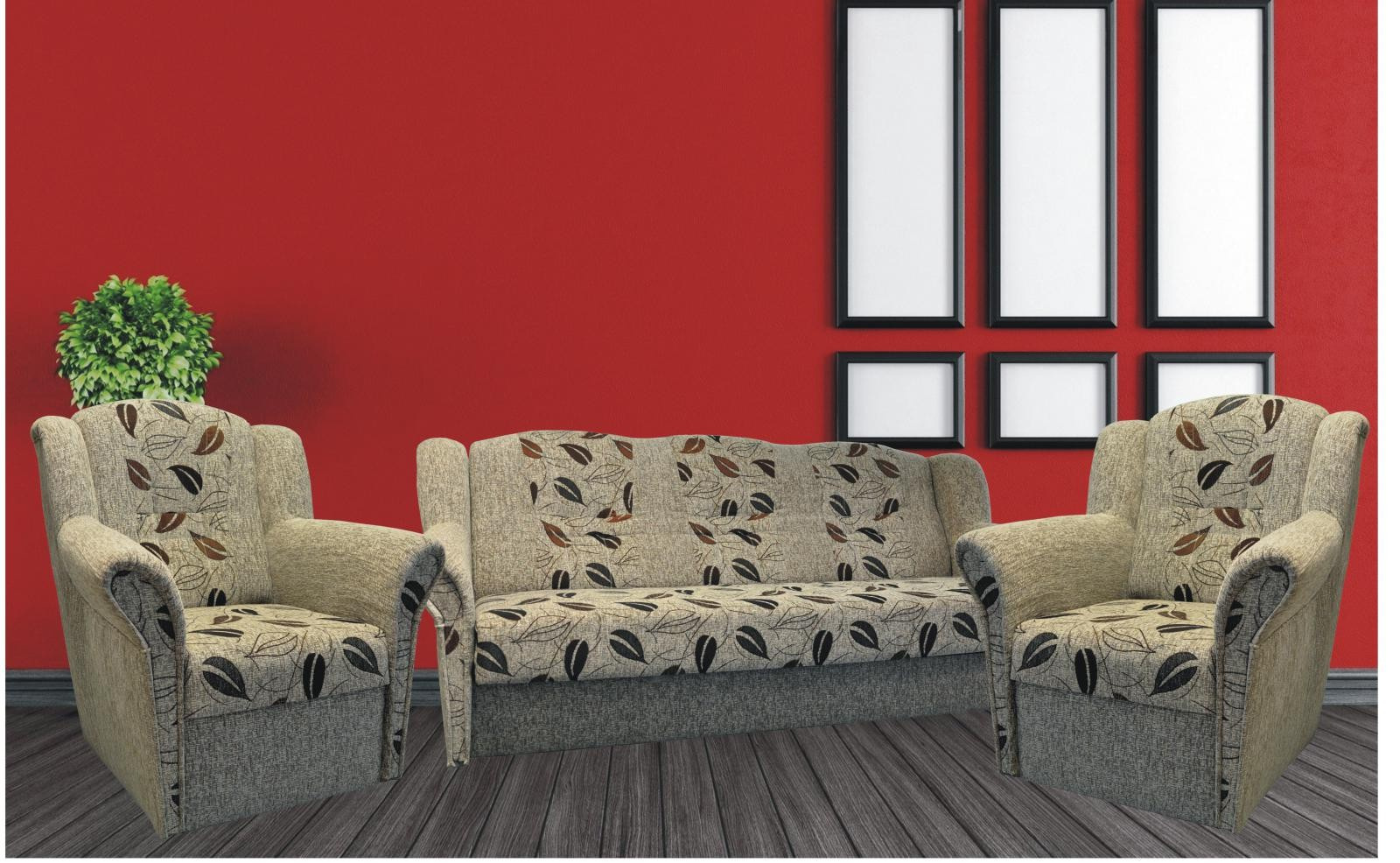Klasická rozkládací sedací souprava vhodná také do menších bytů. Sedací souprava má praktický úložný prostor a jednoduchým rozkladem vznikne lůžko vhodné k příležitostnému spaní. Sedací souprava je pružinová v kombinaci s kvalitní PUR pěnou. Sedací souprava se skládá z rozkládacího trojsedu a dvou křesel. Tato sedačka je očalouněná kvalitní potahovou látkou, snadno čistitelnou suchou pěnou.