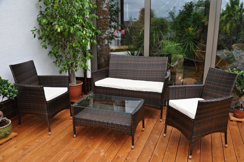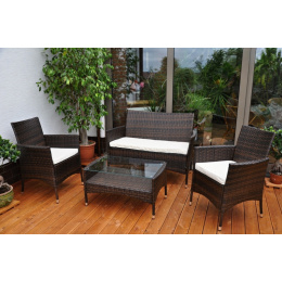 Sedací souprava s kovovou konstrukcí a výpletem z umělého ratanu. Sedací souprava je vhodná pro venkovní použití v zahradách, pergolách či altánech ale i v interiéru. Souprava se skládá z pohovky, 2 křesel, stolku se skleněnou deskou a kompletní sady polstrování. | Materiál konstrukce je ocel, materiál výpletu je umělý ratan odolný proti UV záření. Sedací souprava je vyplétána ručně. Velikost pohovky je 114x62x84 cm, nosnost pohovky je 160 kg Velikost křesla je 59x62x84 cm, nosnost křesla je 110 kg Výška sedu je 42 cm. Velikost stolku se skleněnou deskou z temperovaného skla je 79x48x42 cm Barva polstrů je bílá káva, která má vyšší užitné vlastnosti, než polstry barvy bílé Barva výpletu je znázorněna na další fotografii.
