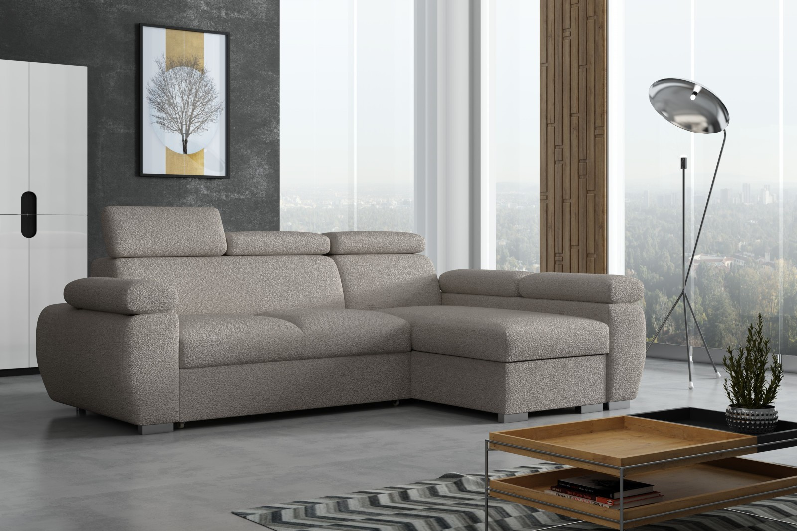 Sedací souprava Bodie se stane příjemným centrem odpočinku, nebo setkání s rodinou a přáteli. Je velmi pohodlná, praktická a nabízí dostatek místa k sezení. Praktickou stránkou sedací soupravy je možnost rozložení k příležitostnému přespání a také nepostradatelný úložný prostor. Pohodlí při sezení zajišťuje výplň sedáků, kterou tvoří kombinace vlnitých pružin s kvalitní PUR pěnou. Při odpočinku, nebo sledování televize Vám zvýší pohodlí polohovací opěrky. Sedací souprava je potažena kvalitní látkou Anthology, která je originální a extrémně měkká, se specifickou bouclé texturou. Látka se snadno čistí a udržuje v perfektním stavu. Sedací soupravu nabízíme v levém i pravém provedení. Vyobrazené doplňky a dekorace nejsou v ceně. Fotografie sedací soupravy v rozkladu jsou pouze ilustrační. Správný barevný odstín je zobrazen na úvodní fotografii.