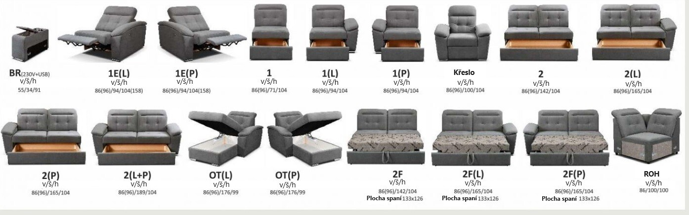 Rozměry sestavy OT+2F+R+1+BR+1E: 176 x 341 x 300, v. 86-96 cm (spací plocha: 270 x 126 cm)