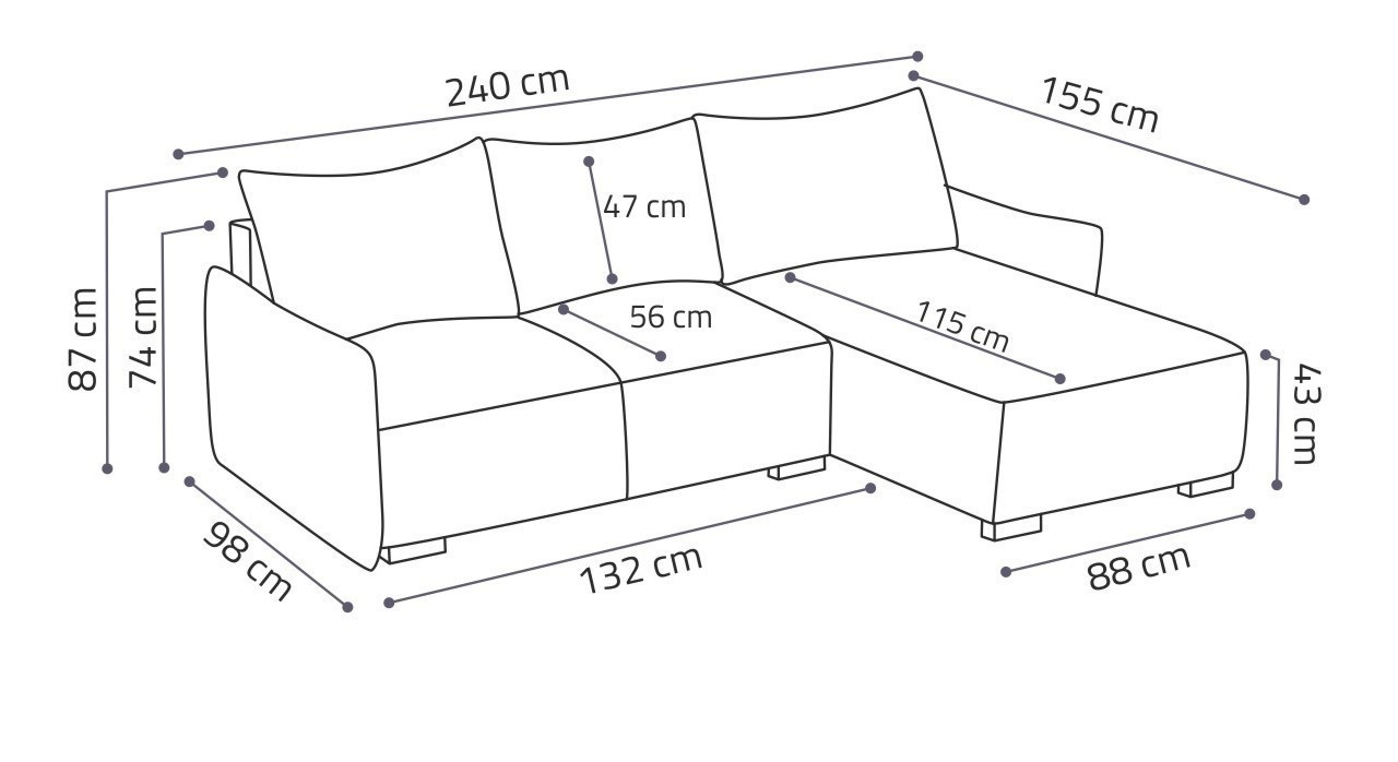Sedací souprava Forest je vyrobena v jednoduchém elegantním designu, který se hodí do všech interiérů. Její velkou předností je univerzální možnost sestavení. Tzn. že podle potřeby můžete mít levou nebo pravou stranu, což je výhoda při zařizování obývacího pokoje. Nemusíte přemýšlet do jakého rohu sedací soupravu postavíte a jednoduše si ji podle potřeby přizpůsobíte. Sedací souprava je rozkládací. Jednoduchým rozložením vytvoříte dostatečně velké lůžko k příležitostnému přespání Vaší návštěvy. Samozřejmostí je i praktický úložný prostor, který můžete využít např. na lůžkoviny. Sedací souprava je potažena kvalitní látkou Neve , která je vyrobena z vysoce kvalitní příze, je měkká a příjemná na dotek. Látka je pevná a oděruvzdorná, snadno se čistí a udržuje v perfektním stavu. Výplň sedáků tvoří kombinace vlnitých pružin s kvalitní HR pěnou. Pro pohodlí při sezení a odpočinku, je sedací souprava vybavena 3 objemnými polštáři. Správná barva potahové látky je zobrazena na první a druhé fotografii. Ostatní fotografie jsou pouze ilustrační.
