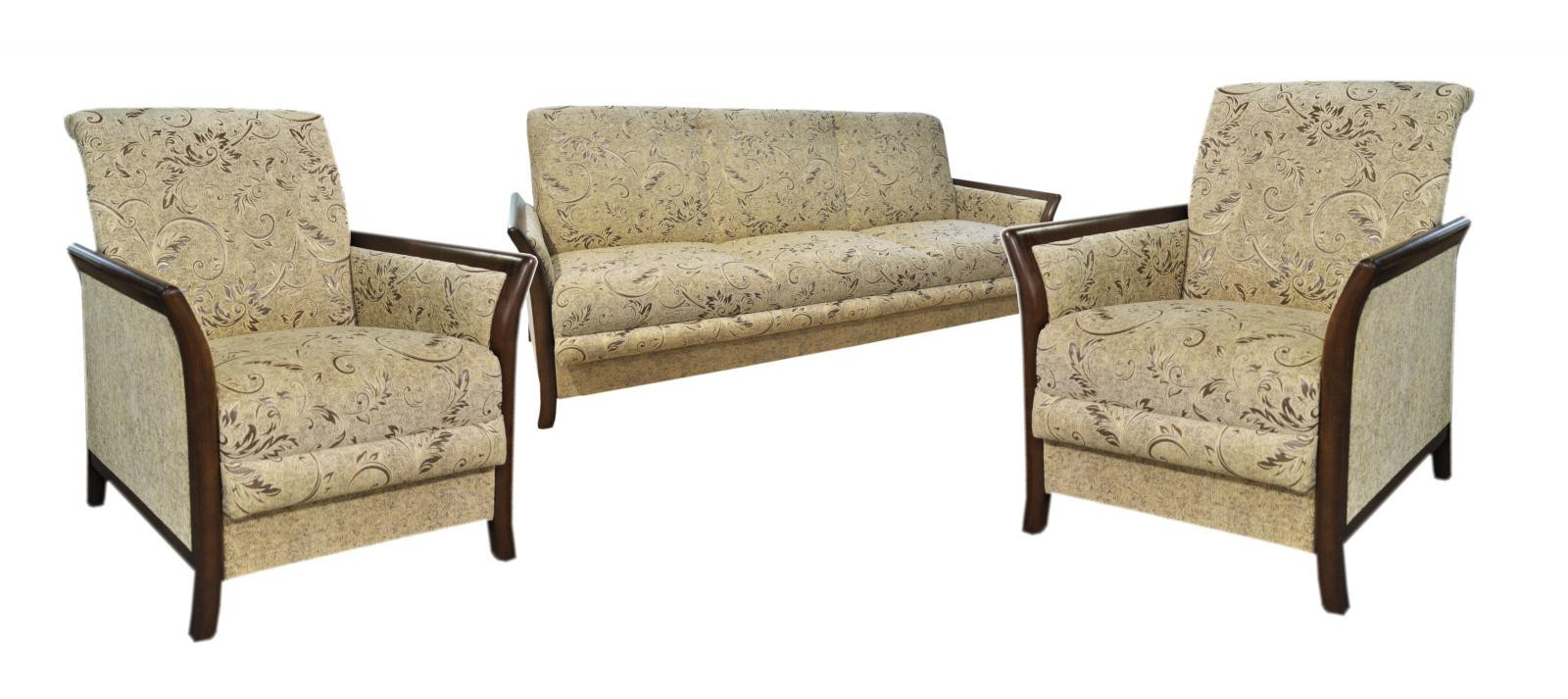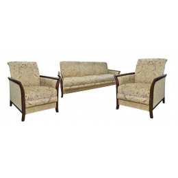 Elegantní sedací souprava Jana s rozkládacím trojsedem a dvěma křesly. Sedací souprava má úložný prostor a jednoduchým rozkladem vznikne lůžko na občasné přespání pro dvě osoby. Sedací souprava je očalouněná kvalitní látkou Vita. Čalounění v kombinaci se dřevem působí velice stylově. Bočnice jsou vyrobené z bukového masivu, moření je možné v různých barevních odstínech. Sedací soupravu lze objednat i v jiných barevných provedeních (viz. vzorník látek níže). Odstíny nebo kresba dřeva nemusí přesně odpovídat vyobrazeným vzorkům.