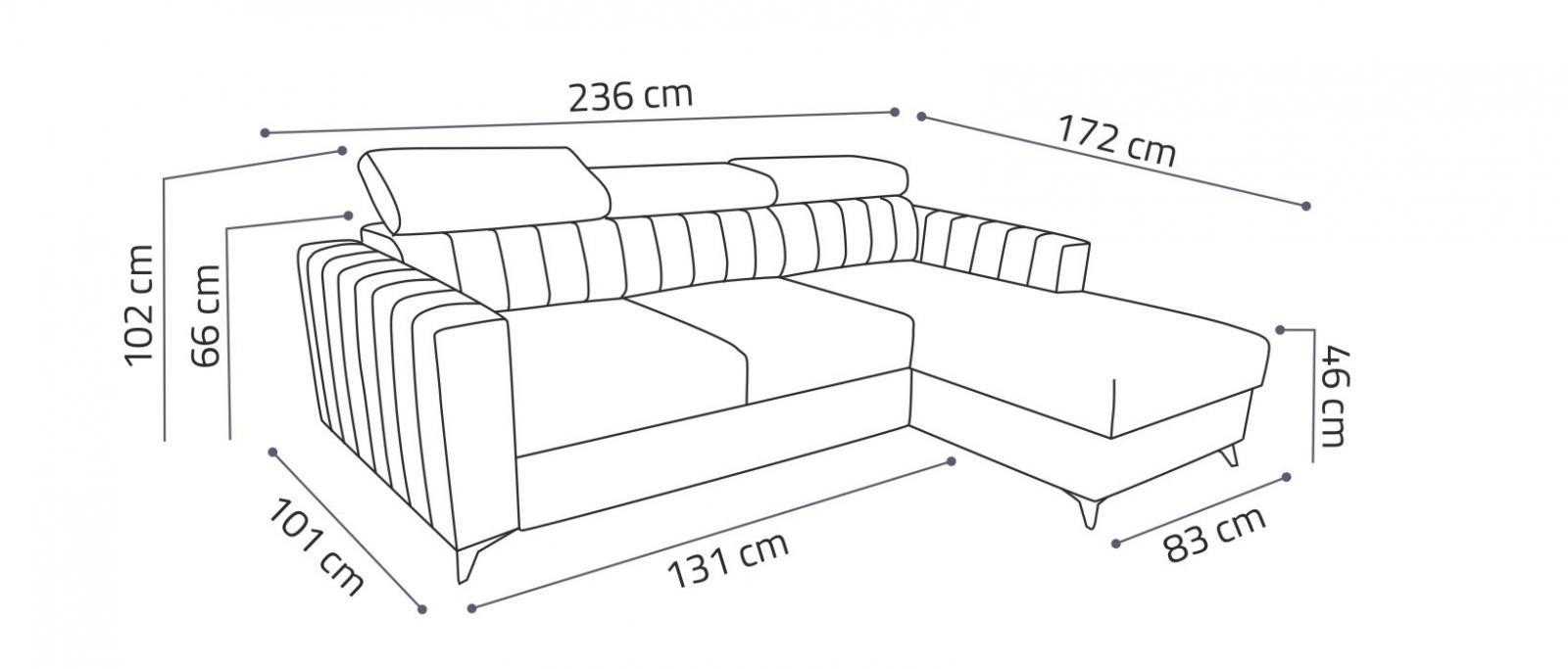 Sedací souprava Mildred osloví každého, kdo preferuje moderní vzhled a zároveň pohodlí a praktičnost. Je potažena kvalitní potahovou látkou. Sedací souprava je velmi pohodlná a dostatečně velká na posezení s přáteli, nebo rodinou. Pro případ, že se návštěva zdrží přes noc, je sedací souprava vybavena rozkladem, díky kterému sedací soupravu jednoduše přeměníte v prostorné lůžko. Sedací souprava má praktický úložný prostor, který můžete využít např., na lůžkoviny. Pohodlí při sezení zajišťuje výplň sedáků, kterou tvoří kombinace pružin faliste s kvalitní PUR pěnou. Komfort a pohodlí při odpočinku zvyšuje polohovací opěrka hlavy. Sedací soupravu nabízíme v levém i pravém provedení.