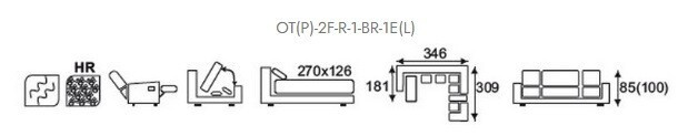181 x 346 x 309, v. 85-100 cm (spací plocha: 270 x 126 cm)