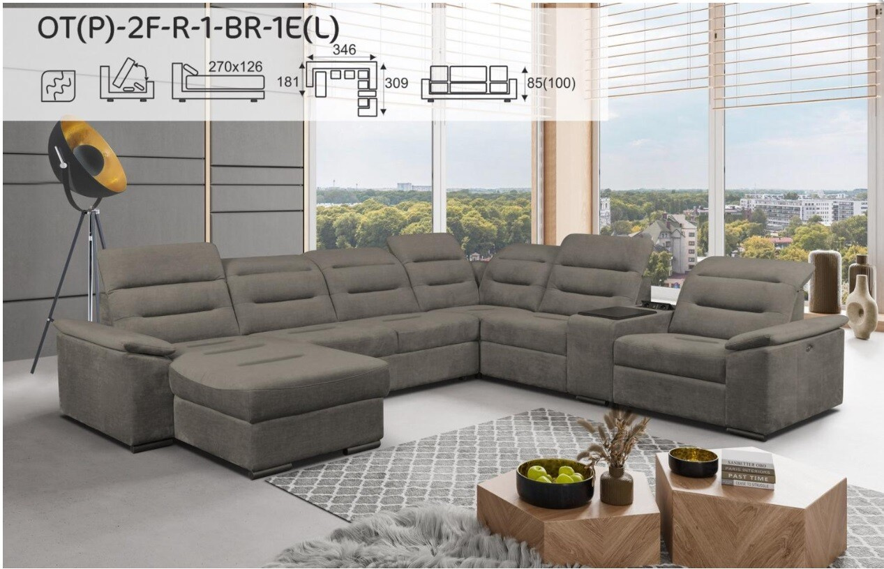 Souprava je navržena ve tvaru "U", což umožňuje optimální využití prostoru a zároveň poskytuje dostatek místa pro pohodlné sezení pro celou rodinu. S šířkou 346 cm, hloubkou 309 cm a maximální výškou 100 cm je tato sedací souprava skvělým doplňkem do každého obývacího pokoje.