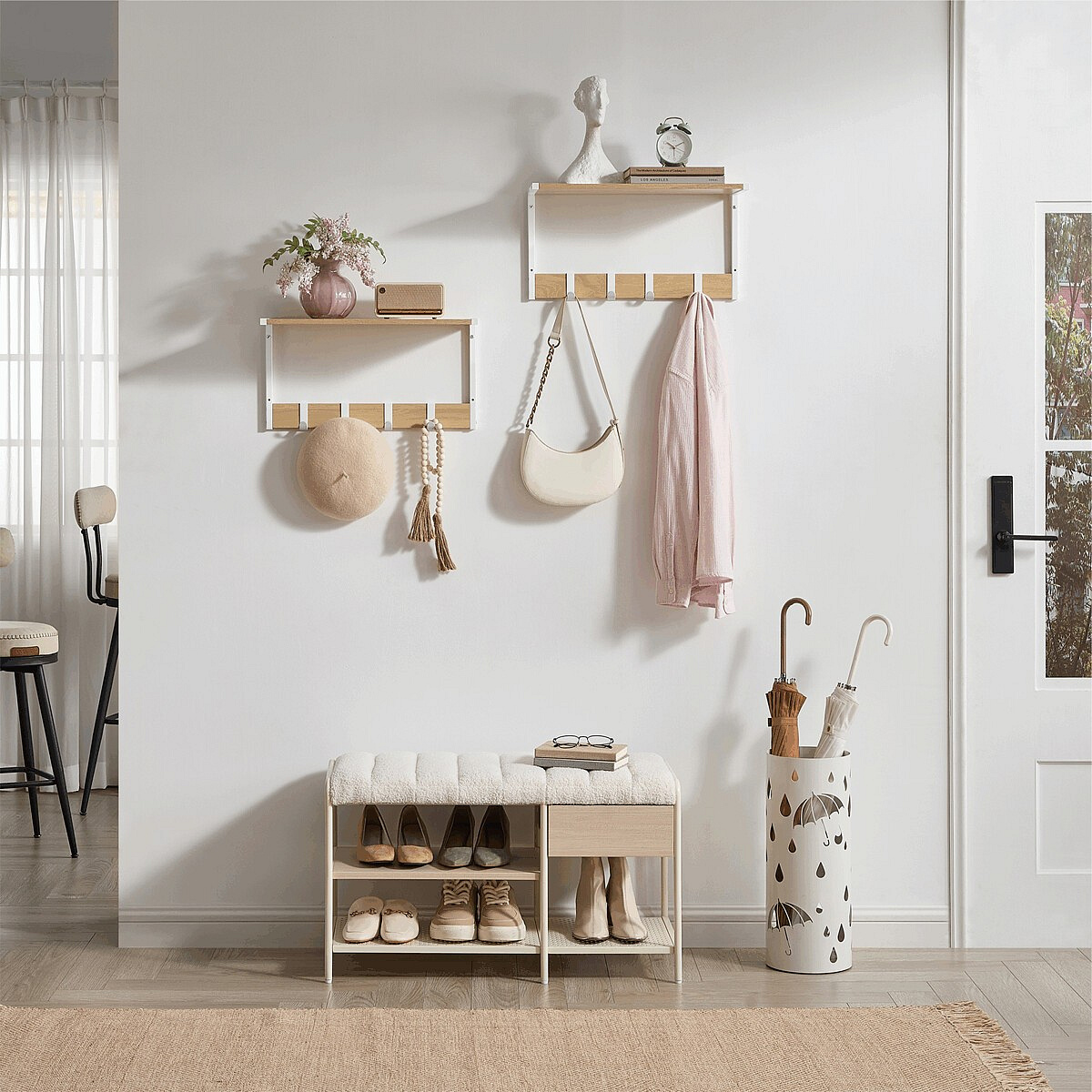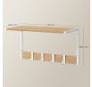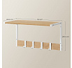 Sada dvou nástěnných polic kombinuje MDF desky v dekoru dubového dřeva s pevnými kovovými nosnými vzpěrami v černé barvě, které zajišťují stabilitu a dlouhou životnost. Police nabízejí praktický odkládací prostor a jsou doplněny o čtyři kovové háčky na každé polici, vhodné pro zavěšení klíčů, drobných doplňků nebo kuchyňského náčiní. Povrch desek je upraven v odstínech přírodního dřeva, což přispívá k příjemné atmosféře interiéru. Kompaktní rozměry 50x24x27 cm umožňují snadné umístění v chodbě, kuchyni či pracovně. Díky kombinaci materiálů se snadno udržují a jsou vhodné pro různé typy interiérů.