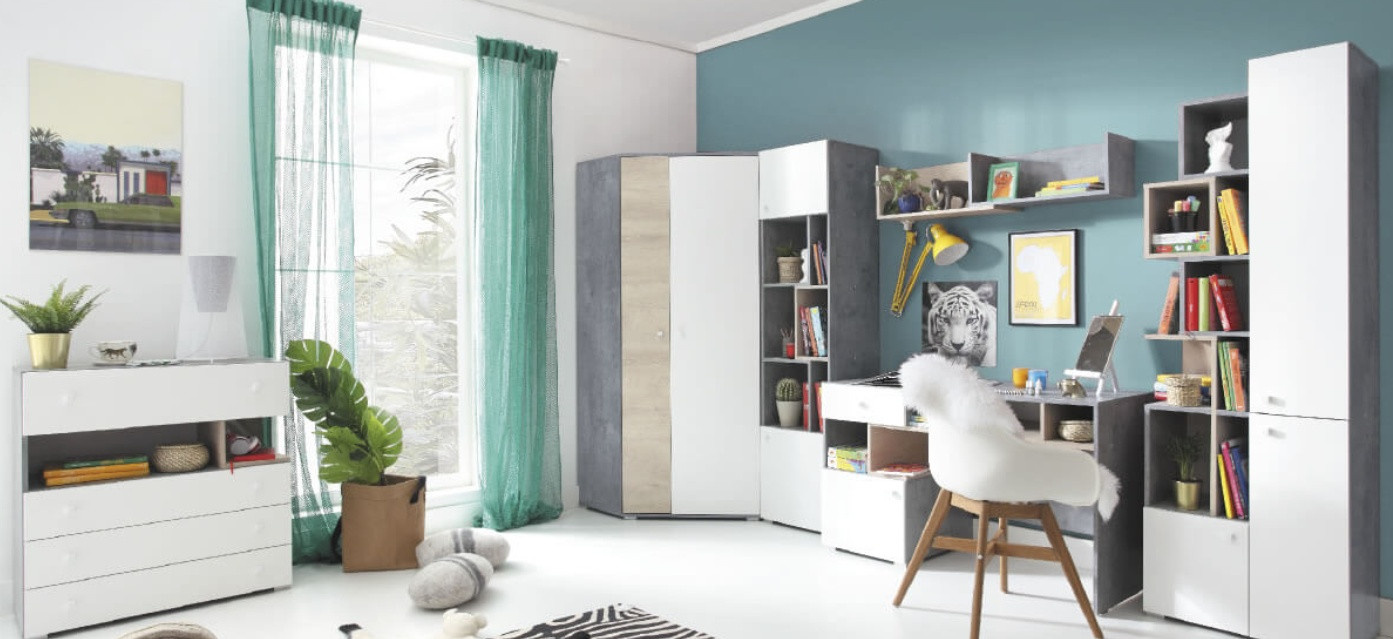 A SIGMA bútor gyermek- és diákszobákba készült, és két színváltozatban kapható: Beton+Fehér Lux+Tölgy és Fehér Lux+Beton.