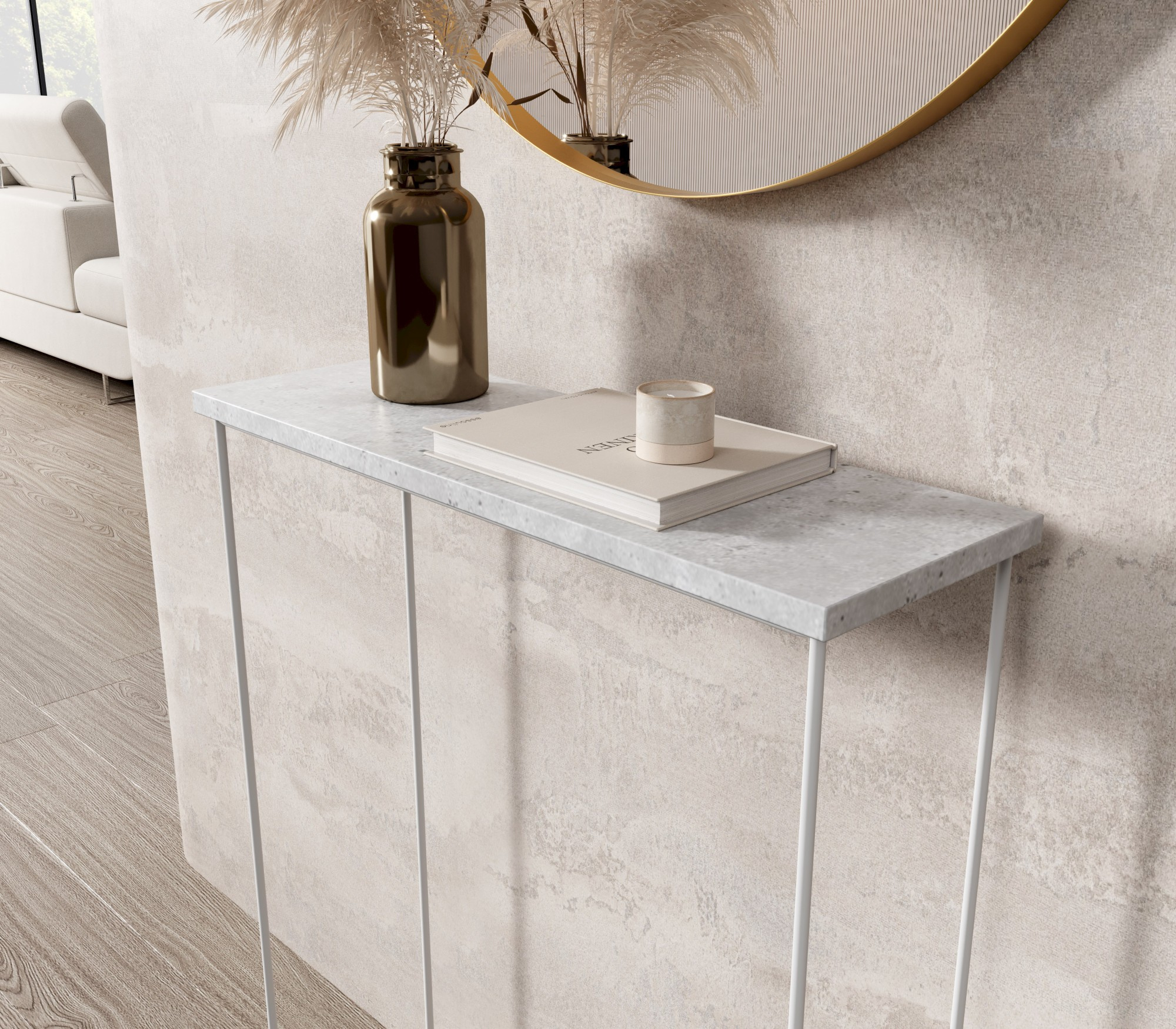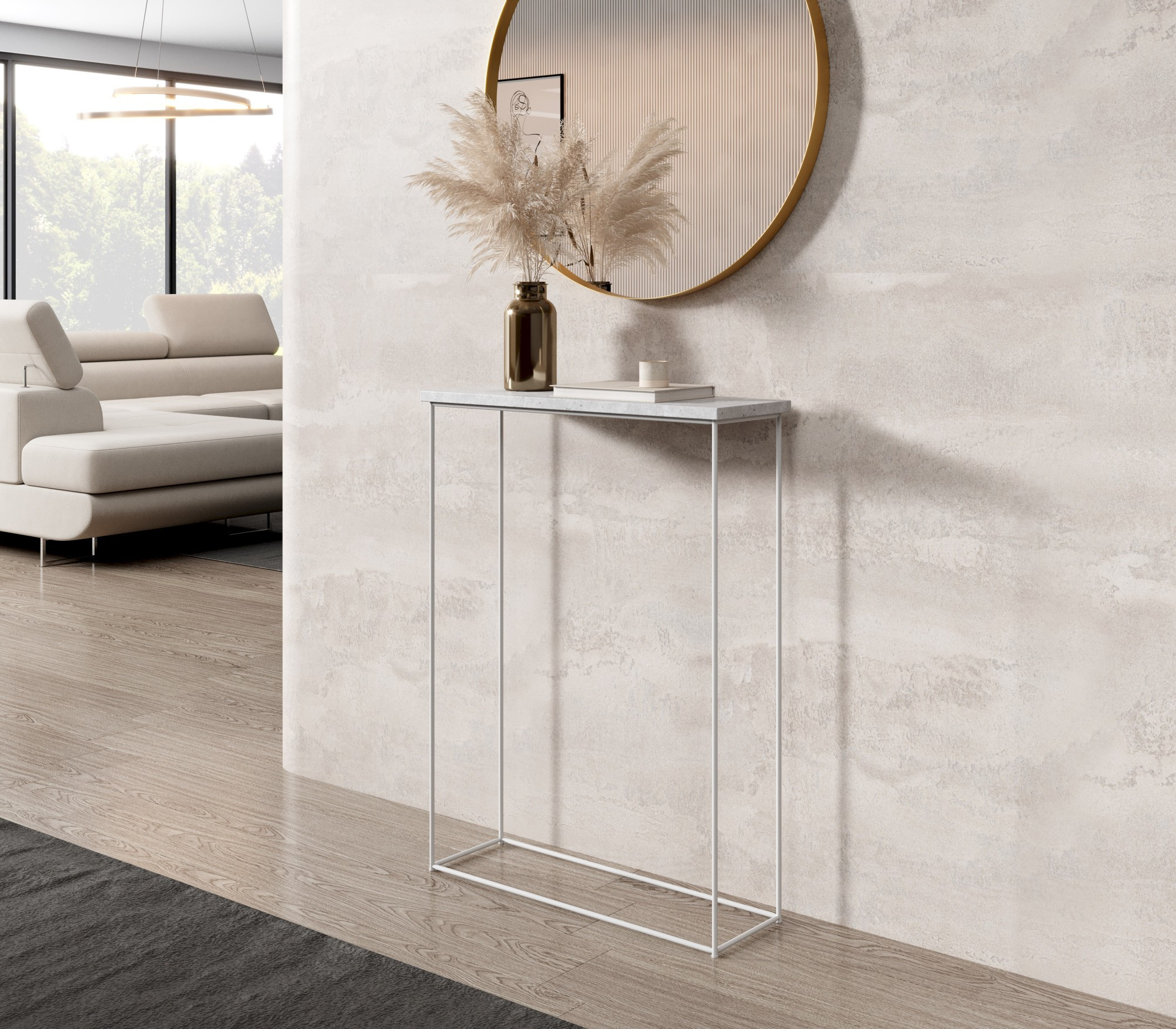 A Sili konzol asztal drót lábbal nagyszerű kiegészítője bármely belső térnek. Univerzális kialakítása biztosítja, hogy illeszkedjen mind a modern, mind a klasszikusabb elrendezésekhez. Szolgálhat praktikus térként az előszobában, elegáns kiegészítőként a nappaliban vagy stílusos munkahelyként az irodában.