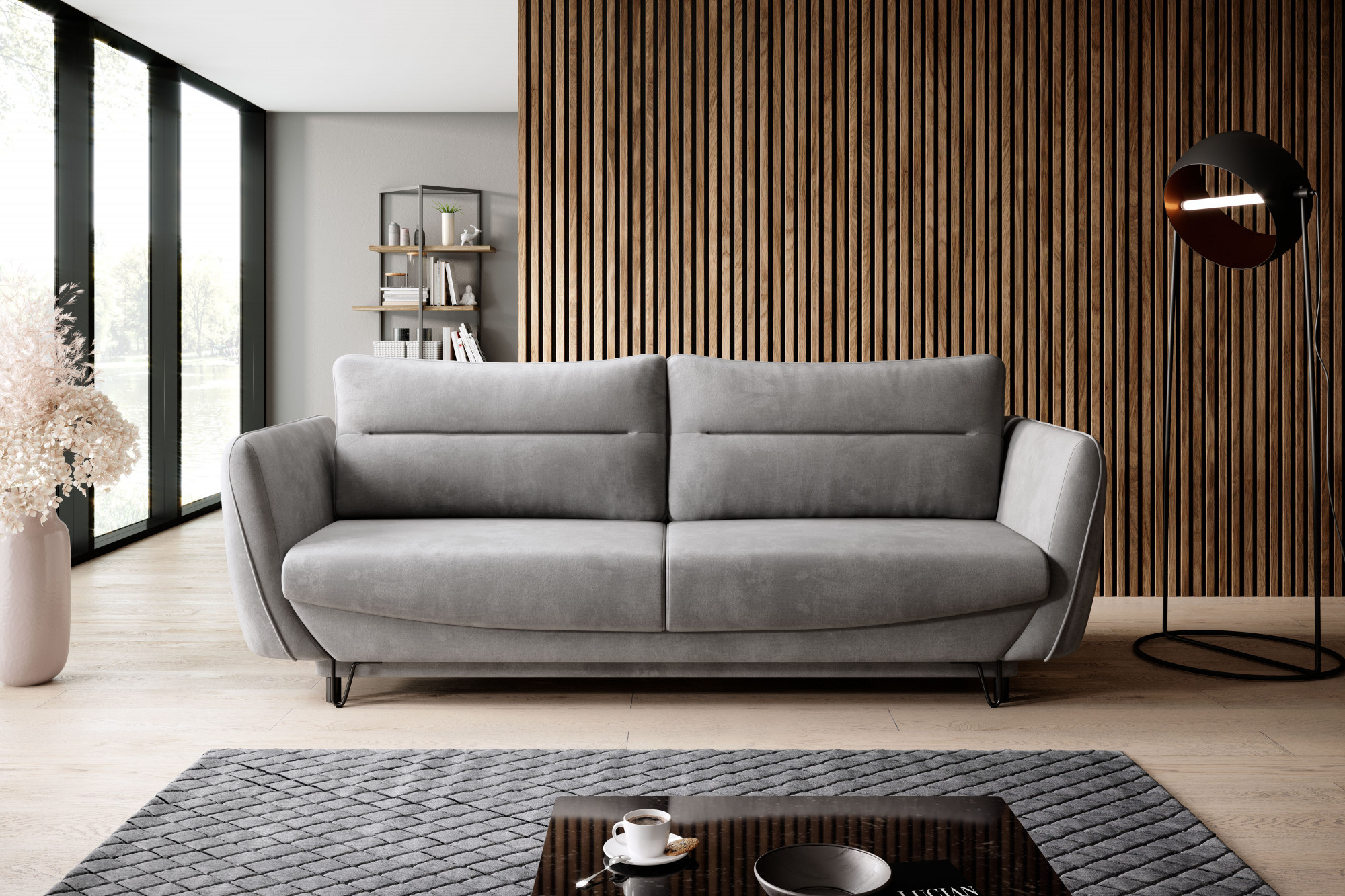 Silva sofa is a combination of simple, yet unconventional form and high quality materials. Designed for those who love comfort and elegance. This simple, yet elegant piece of furniture is a good choice not only for the living room, but also for office spaces or hotels.Particularly noteworthy in the design of the sofa are the modern black steel long legs. Thanks to them and the ability to choose the color of the fabric, the furniture easily fits into many arrangements. In addition to its aesthetic qualities, Silva can also boast functionality, thanks to its capacious bedding storage. The furniture's interesting design is also a good solution for minimalist interiors, as its dimensions are: 236 x 95 x 90 centimeters. Silva is equipped with a comfortable backrest in the form of cushions with T25 foam filling, combined with seat cushions with HR high elastic foam. In addition, the sofa has a sleeping function on a surface of 200 x 145 centimeters and a DL automatic to help unfold the furniture.