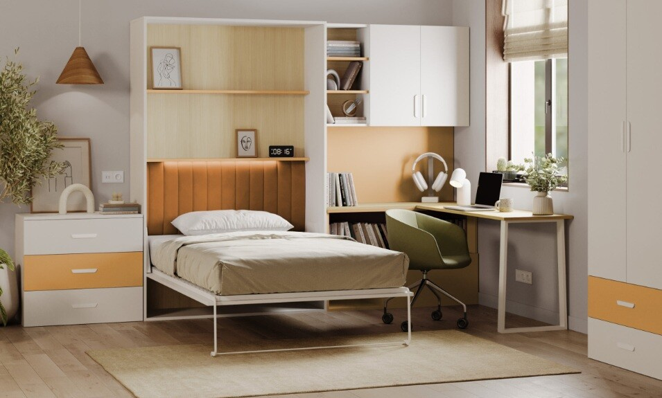 - Snadné použití: Výklopná postel se jednoduše rozloží na pohodlné lůžko a po složení odhalí plně funkční stůl a systém polic, ideální pro studium nebo práci.
