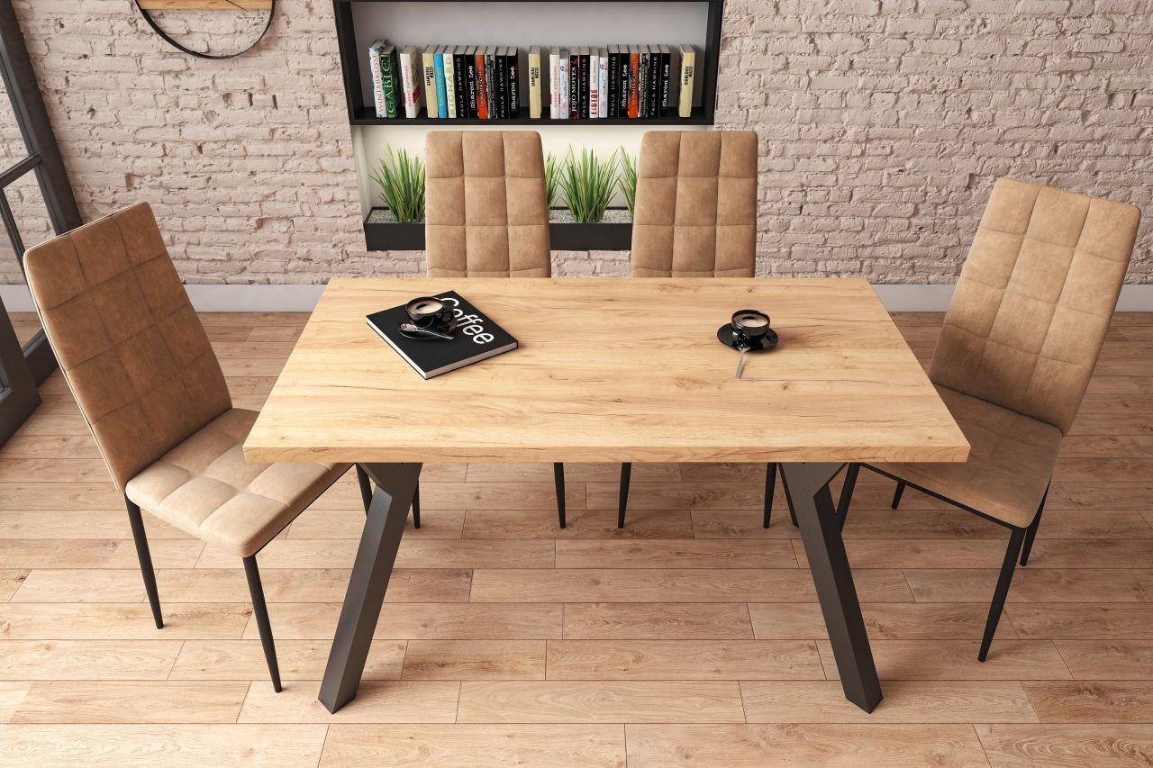 Méretek: - hosszúság: 128 cm - szélesség: 67 cm - magasság: 75 cm - lap vastagsága: 3,8 cm - láb profil: 6x6 cm Anyag: - lap: laminált lap - lap szélei: ABS műanyaggal zárva - láb: porfestett acél Szín: - lap: arany tölgy craft - láb: fekete