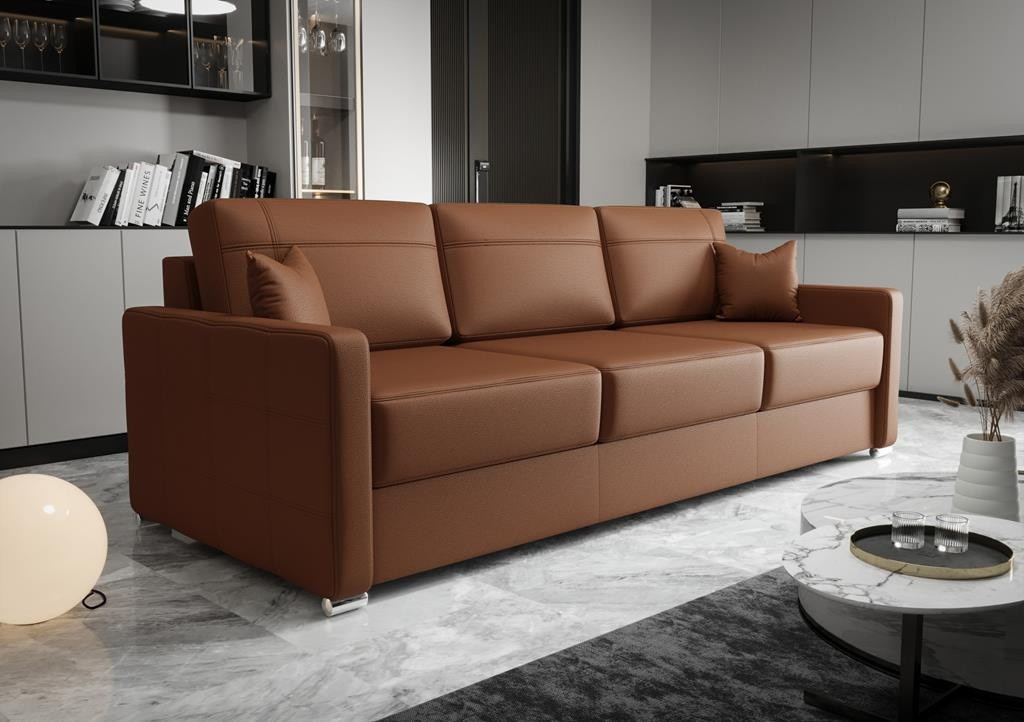 SOFA SKÓRA NATURALNA AVANTI DL Skórzana sofa Avanti DL z kolekcji Avanti to połączenie klasyki z komfortem, który gwarantują profilowane siedziska i oparcie z wygodnymi poduszkami. Całość obszyta jest ozdobnym szwem. Wykonanie: Wszystkie elementy są obszyte grubym szwem dlatego połączenie tkanin jest wzmocnione i dodatkowo stanowi to specyficzną ozdobę. Gwarantujemy dużą odporność siedzisk na odkształcenia ponieważ zastosowaliśmy sprężyny faliste i piankę wysoko elastyczną T35. Twardość siedzenia w naszych sofach typu amerykanka określamy jako średnio-twarde. Stelaże wykonane są z drewna i płyty meblowej, siedziska natomiast i elementy silnie obciążone zbudowaliśmy na ramach drewnianych w związku z czym meble są niezwykle wytrzymałe. Sprawdź całą ofertę na nasze sofy i kanapy ze skóry naturalnej. Sofa Skórzana Avanti posiada: poduszki pełniące funkcję oparcia z odpinanymi pokrowcami łatwymi do czyszczenia funkcję spania rozkładaną na automacie siedziska na sprężynach falistych pojemnik na pościel wykonany w całości z płyty laminowanej Meble skórzane to produkt niezwykle elegancki i ekskluzywny. Ich unikatowy design i precyzja wykonania przyniosą Ci odrobinę luksusu, niebywały komfort i fenomenalny wygląd pomieszczenia. Świetnie sprawdzą się zarówno w salonie, sypialni, biurze, gabinecie jak i w innych pomieszczeniach. Połączenie jakości, funkcjonalności i piękna. Wzornik skór naturalnych: Madras jednokolorowy półmat, symbol K Madras antykowany połysk, cieniowana, symbole A, C, S Federica pół-połysk, symbol G Skóry mogą wykazywać delikatne różnice w kolorystyce, strukturze powierzchni i mogą posiadać drobne blizny. Wynika to z naturalnego środowiska, w którym żyły zwierzęta i nadaje skórze jak i meblom indywidualny charakterystyczny wygląd. Cechy te absolutnie nie mają wpływu na trwałość użytkową mebli a wręcz przeciwnie. Takie i podobne zaniki nie są wadą, a jedynie potwierdzeniem autentyczności naturalnej skóry. Wirtualna galeria Już teraz możesz obejrzeć nasze realizacje bez wychodzenia z domu, ponieważ udostępniliśmy dla Ciebie GALERIĘ. Możesz również śledzić nas na FACEBOOK. Miłego oglądania! Wszystkie meble wykonywane są pod indywidualne zamówienie. Prosimy o przemyślane zakupy. Towar nie podlega zwrotowi.