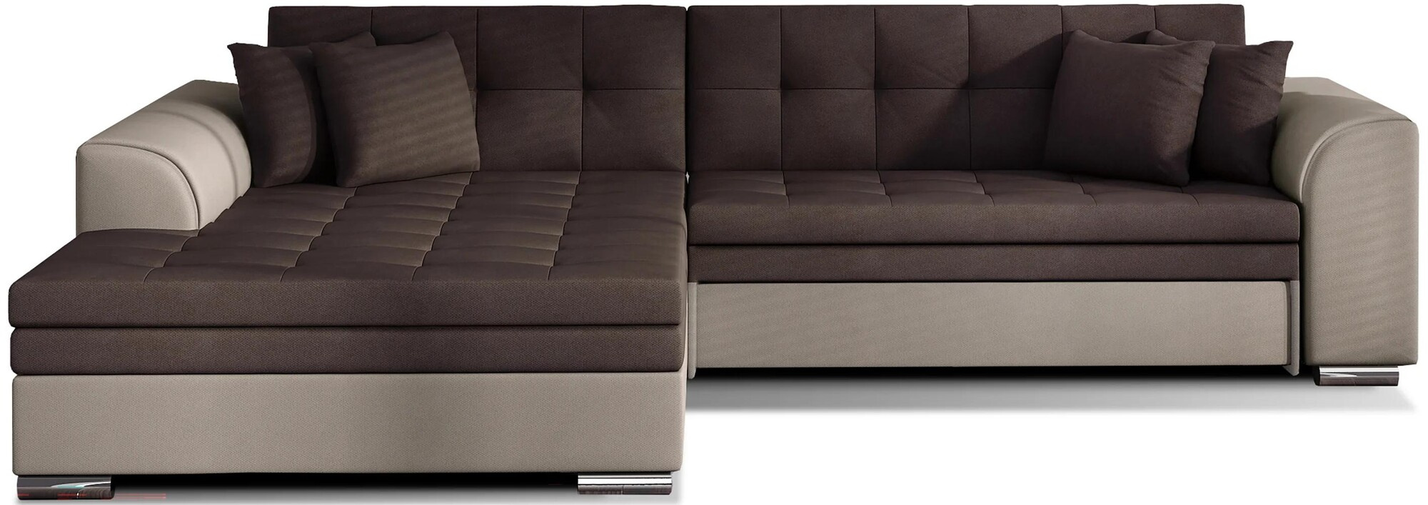 Sorento is a stylish, multifunctional corner sofa with a stable L-shaped structure, which will serve you as a piece of furniture for many years. The sofa, measuring 295 x 195 x 80 cm, works well not only as a place for daytime relaxation, but also as a central decoration of the living room. Thanks to the dolphin-type mechanism, the Sorento corner sofa is also suitable for night rest. The sleeping surface, measuring 210 x 126 cm, ensures a long sleep and full relaxation. Maximum comfort is guaranteed by the combination of corrugated spring and T30 foam, from which the seat is made. When choosing a Sorento corner sofa, it is worth noting its unusual style, as well as: contoured backrest, rounded armrests and stylish quilting, which add character. Sorento is style, comfort and class in itself. It is certainly worth having such a piece of furniture in your apartment. Sorento is style, comfort and class in itself. It is certainly worth having such a piece of furniture in your apartment.