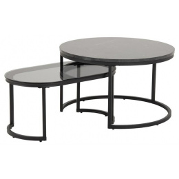 Modern két dohányzóasztal készlet, amelynek vitathatatlan előnye, hogy a kisebb elrejthető a nagyobb alá. A dohányzóasztalok kerek asztallapjai füstüvegből és kőhatású furnérozott MDF-ből készültek. Az átlátszó és fényes üveglap érdekesen harmonizál a fekete, fém alacsony asztal alapjával. Magasabb asztalka, szintén fém alappal, márványt utánzó lappal volt díszítve. A kerek asztalok tartós és stabil alapja porfestett fémből készült. A Spiro asztalkészlet ideális dohányzóasztal a nappaliba vagy a váróterembe. A modern stílusú asztalok bármilyen belső térbe illenek, és annak díszei lesznek. A készlet tartalmaz egy nagyobb kerek asztalt és egy kisebb ovális asztalt. Asztalok súlya: 15 kg Karton méretei: 81 x 14 x 75 cm