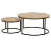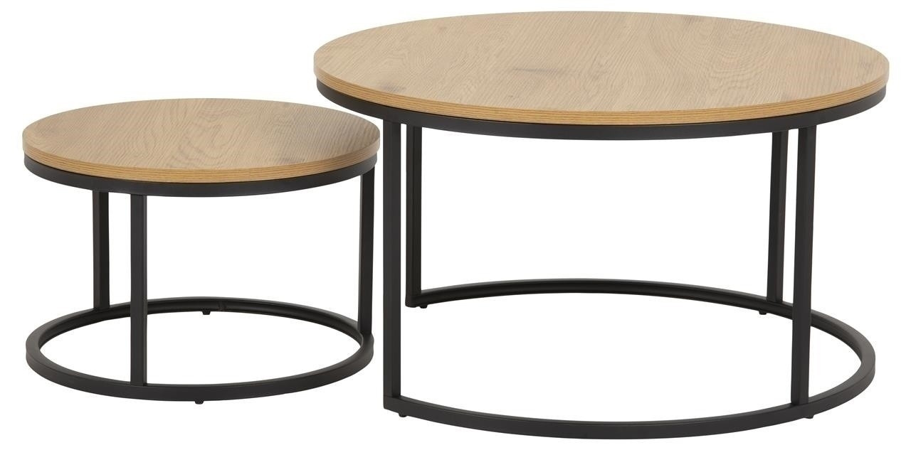Modern két kerek dohányzóasztal készlet, amelynek vitathatatlan előnye, hogy a kisebb asztal elrejthető a nagyobb alá. A kerek asztallapok laminált MDF lapból készültek. A természetes tölgy mintázatú és színű laminátum érdekesen harmonizál a fekete fém asztalok alapjával. A kerek asztalok tartós és stabil alapja porfestett fémből készült. A Spiro asztalkészlet ideális dohányzóasztal a nappaliba vagy a váróterembe. A modern stílusú asztalok bármilyen belső térbe illenek, és annak díszei lesznek. Asztalok súlya: 15 kg Karton méretei: 86 x 17,2 x 77,5 cm