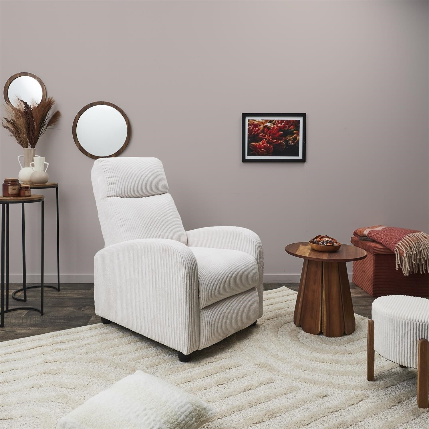 A fehér kordbársony anyagú relaxációs fotel ideális bútordarab a nappaliba vagy a váróterembe. A kihajtható fotel segít a relaxációban, és a háromszintű háttámla beállítási lehetőség garantálja az ideális és általunk preferált testhelyzetet. Kézzel kihúzható fotel. A háttámla 3 szintű beállítása és a lábtartó 3 szintű kiterjesztése. Max. szék terhelhetősége: 120 kg. Kárpitozó hab sűrűsége: 22kg/m3 Összeszerelést igényel. Nem alkalmas külső használatra. Szövet 100% poliészter.