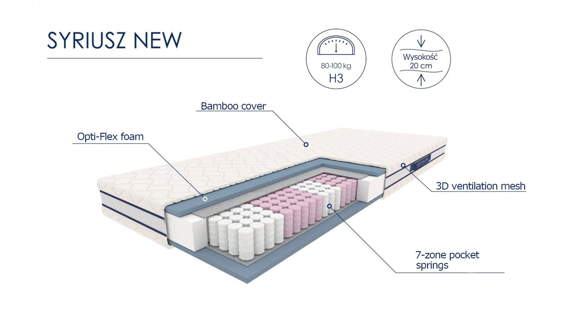 wymiar: 90/200 cm, wkład: sprężyna kieszeniowa 7-strefowa, przekładki tapicerskie, płyty z pianki Opti-Flex, pokrowiec: tkanina Bamboo, pikowana owatą 200 g/m2, siatka wentylująca 3D, uchwyty i zamki rozdzielcze, temperatura prania do 40°C, wysokość: około 20cm, twardość: średnia