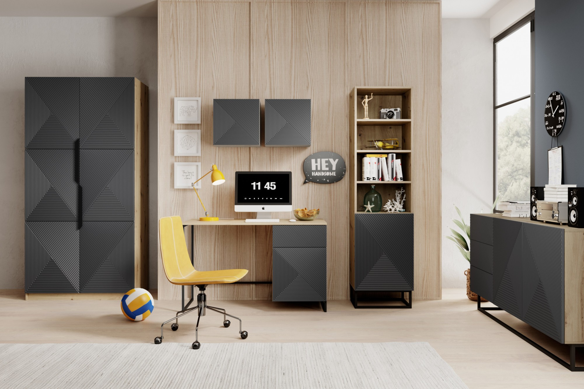 Szafa Asha z ryflowanym frontem i metalowymi uchwytami 100 cm - artisan / rivier stone mat / czarne uchwyty