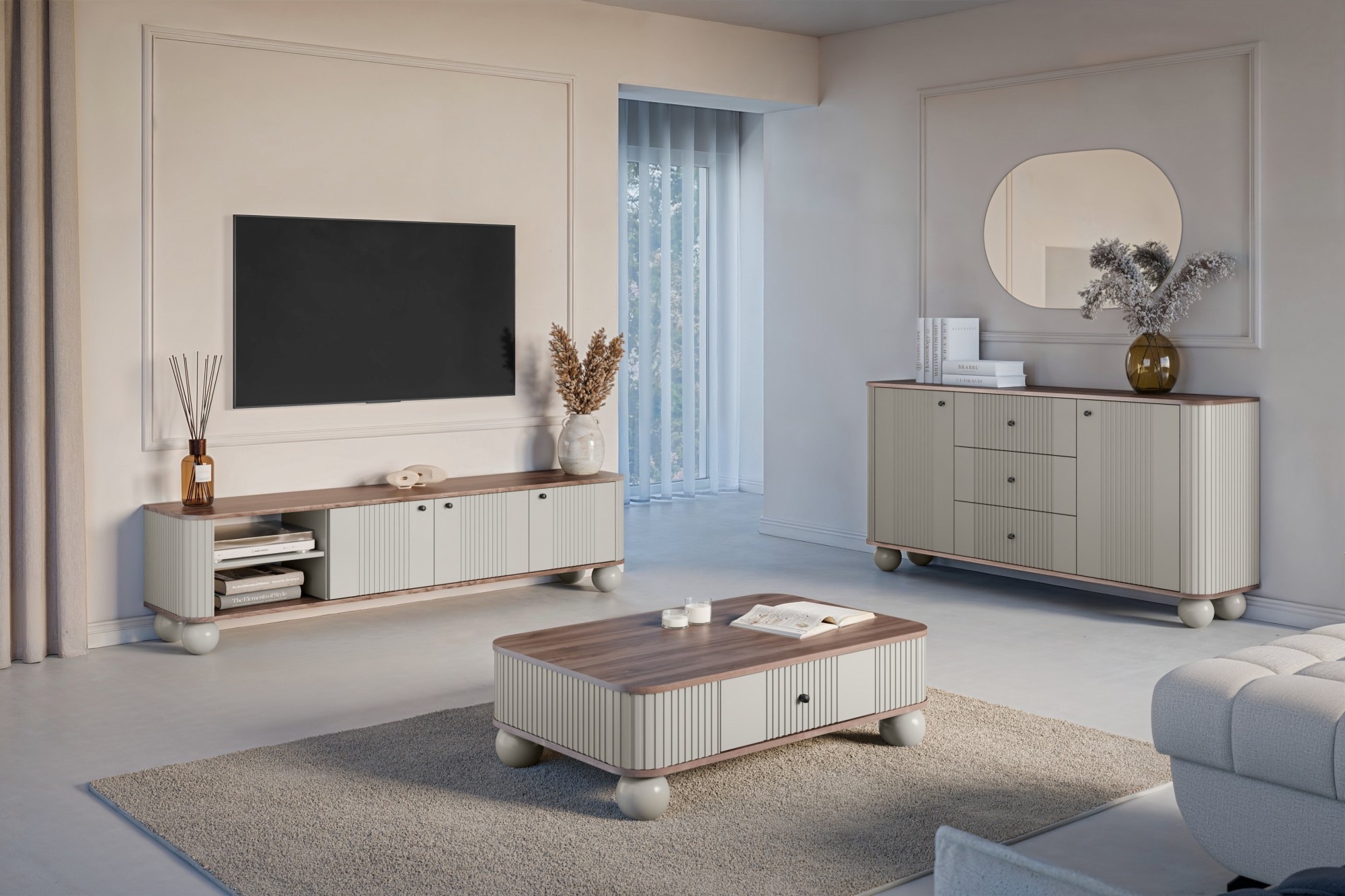 Szafka RTV Vesper 3D 187 cm - kaszmir / orzech / czarne uchwyty / nogi kule