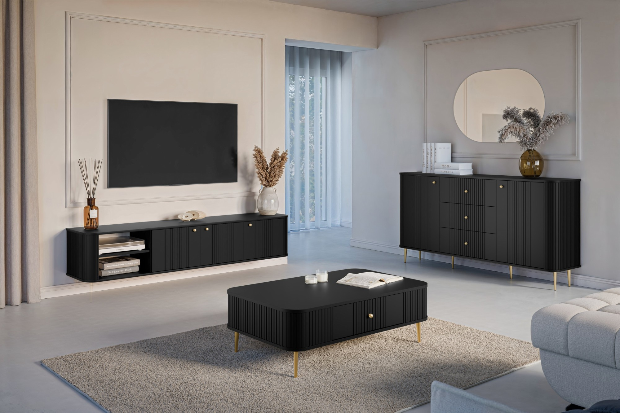 Szafka RTV Vesper 3D wisząca 187 cm - czarny / złote uchwyty