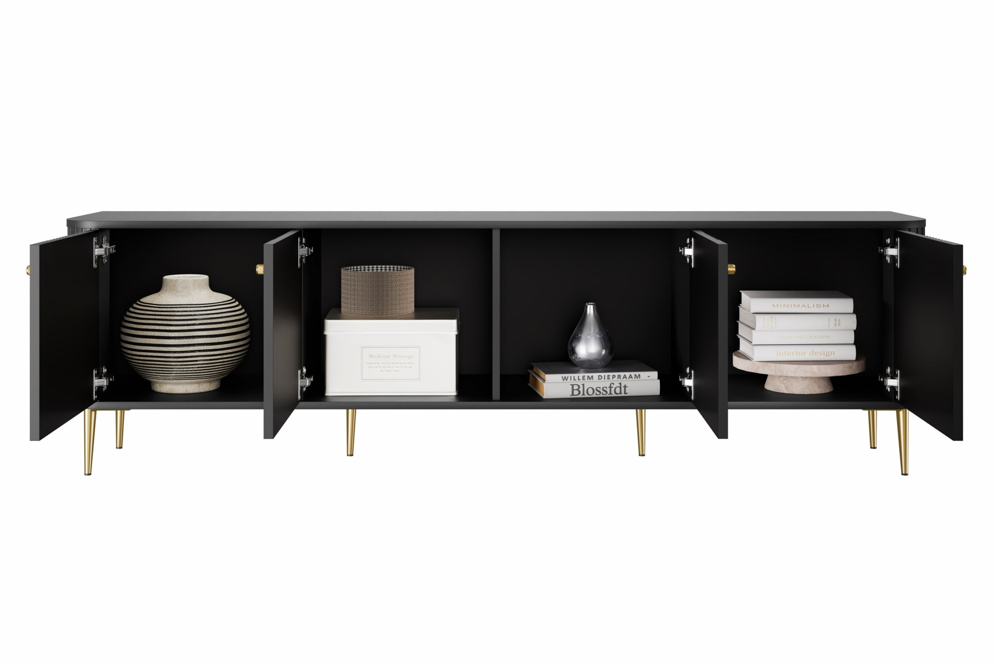 Szafka RTV Vesper 4D 187 cm - czarny / złote nogi, Szerokość: 187, Wysokość: 51, Głębokość: 38, Wysokość nóżek: 15, Głębokość blatu: , Montaż: