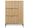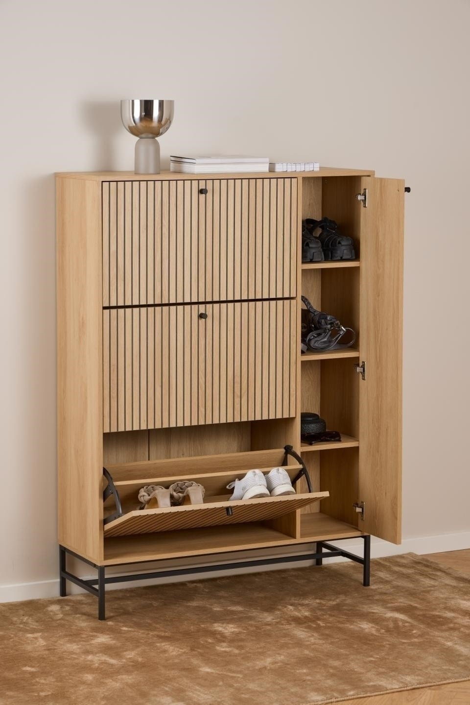 Természetes tölgy megjelenésű cipősszekrény lamellás előlapokkal stílust és praktikusságot kölcsönöz az előszobának. A tölgy kontrasztos megjelenése fekete akcentusokkal kiegészítve jól kiegyensúlyozott vizuális hatást kelt. Helyezze a szekrényt az előszobába, hogy kihasználja a teret és a cipőket szem elől tárolja. Cipősszekrény lamellás előlappal.. Könnyen karbantartható felület tölgy megjelenéssel. FSC tanúsítvány. Lasse Cha Pedersen tervezte és kizárólag az Actona számára védett Lábmagasság: 18 cm Max. cipő hossza 35 cm Összeszerelést igényel Karton méretei: 81x69x11 cm súly 17 kg, 151x59x151, súly 16,7 kg