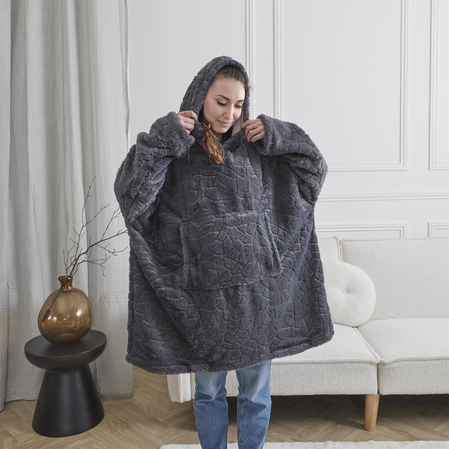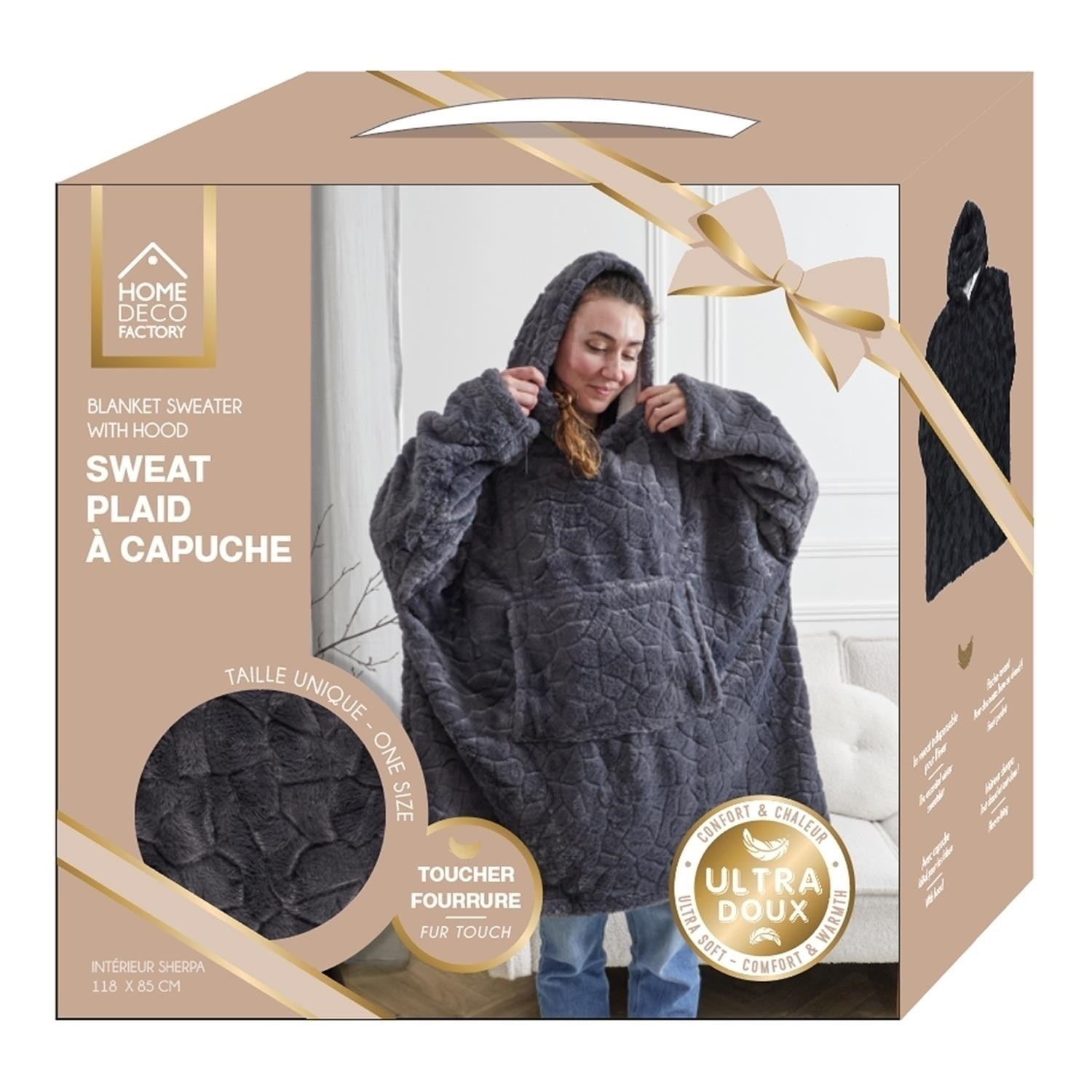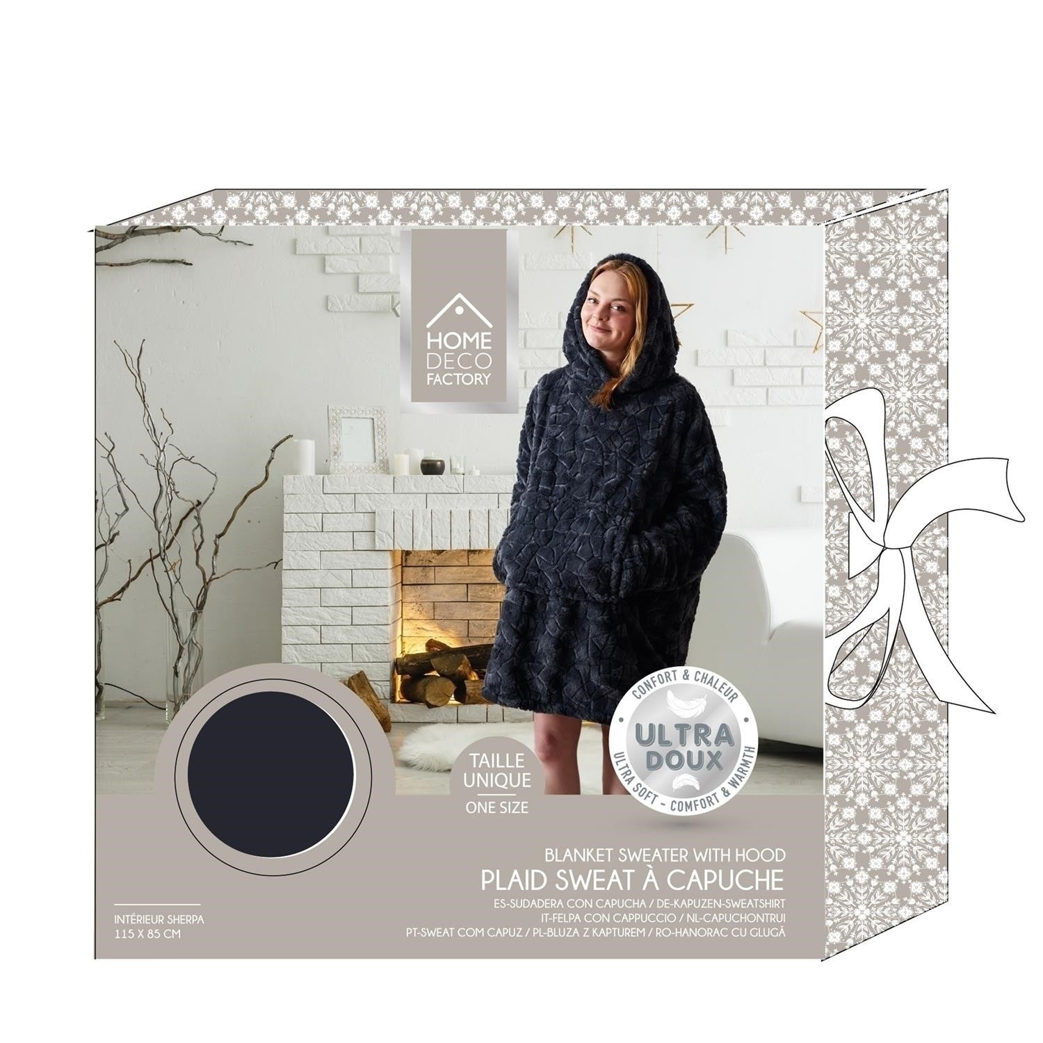 A hosszú sherpa pulóver ideális takaró a hosszú téli estékre. A snuddie pulóver kapucnival és elülső zsebbel van ellátva. Nagyon kellemes és meleg tapintású anyag garantálja a hosszú, kényelmes filmestéket. Mosás legfeljebb 30 fokon. Ne vasaljon. Szövet súlya 320g/m2, anyag 100% poliészter