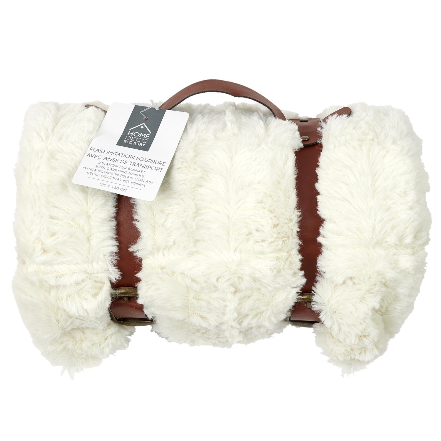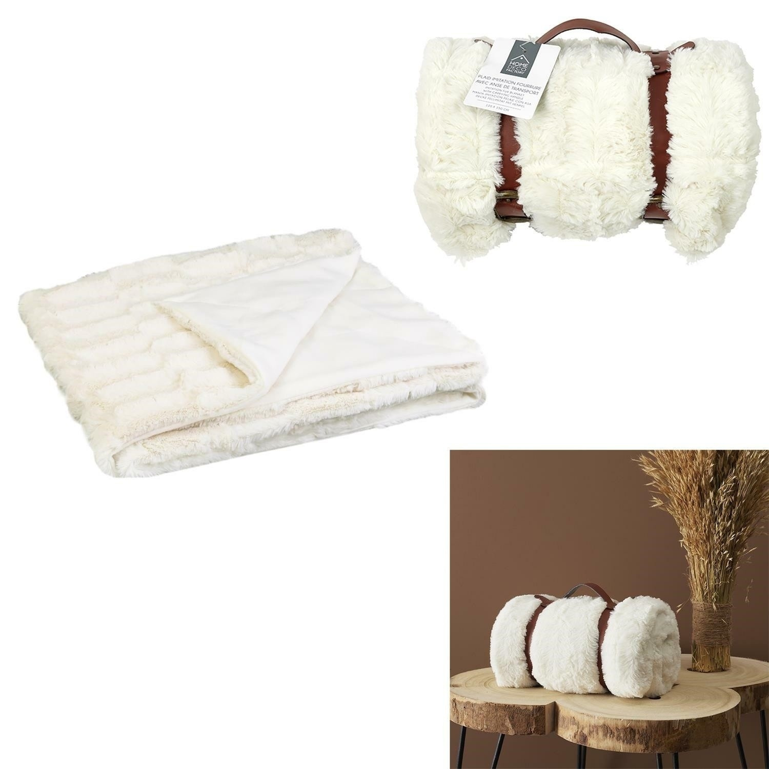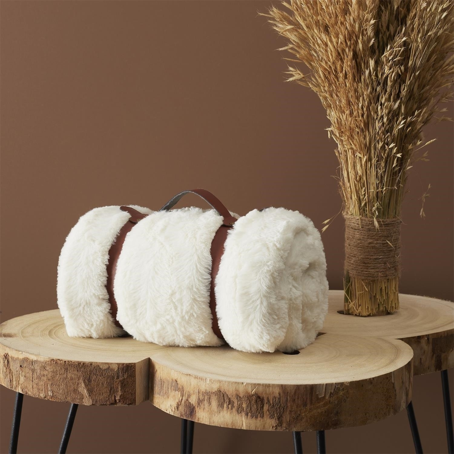 A Furry takaró fehér-krém színű, nagyon kellemes tapintású poliészter szálakból készült. A Furry pokróc bőr pánttal van felszerelve, amelynek köszönhetően könnyen szállíthatjuk a feltekert takarót.