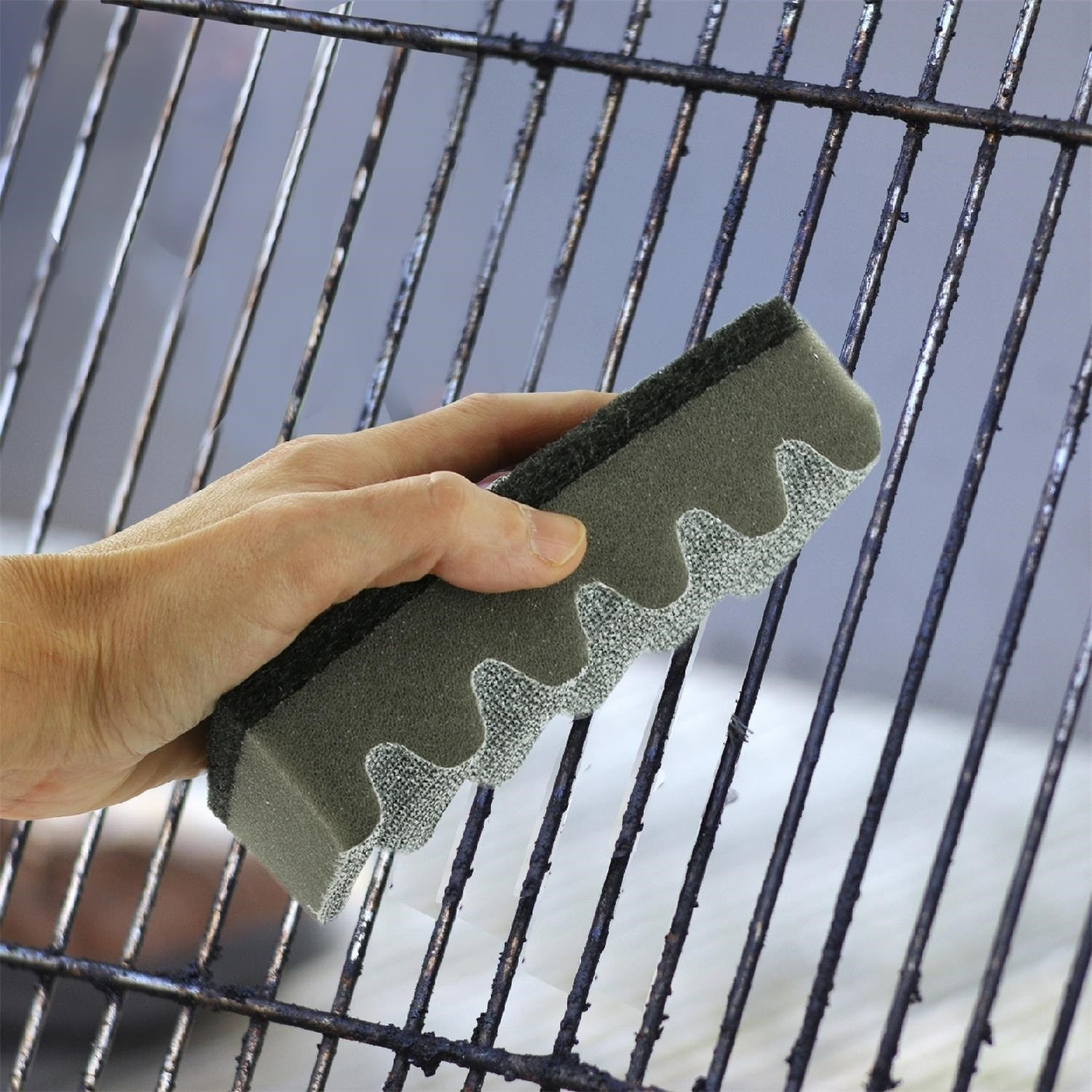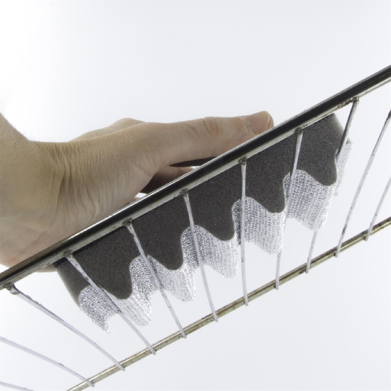 A rácstisztító szivacs nemcsak grillezéskor, hanem a háztartási sütő tisztításakor is beválik. A szivacs egyik oldala hullámos, fém szerkezettel van ellátva, amely tökéletesen tisztítja a rács minden egyes rúdját. A szivacs másik, puhább oldalával áttörölhetjük a sütő és a grill finomabb részeit.