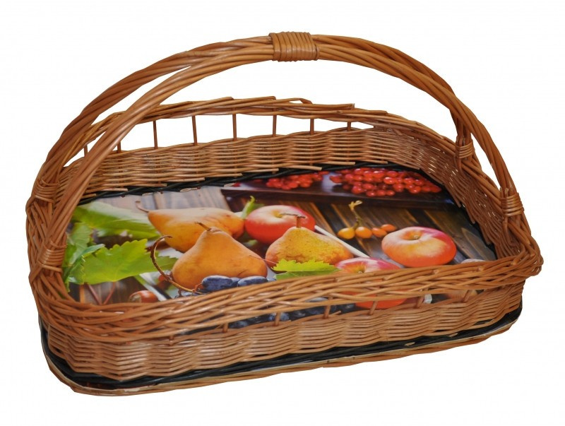 Tác s pevným dnem a výpletem z loupaného vrbovéhou prutí v přírodní barvě. | Velikost tácu je 48x35x25 cm. Pevné dno tácu má dekor s motivem ovoce.>
