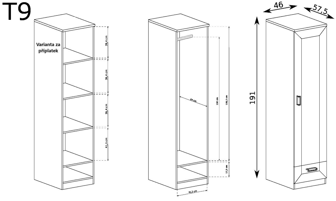 A szekrény része egy fiók is. A szekrény része egy rúd, amely azonban felár ellenében három polccal helyettesíthető.