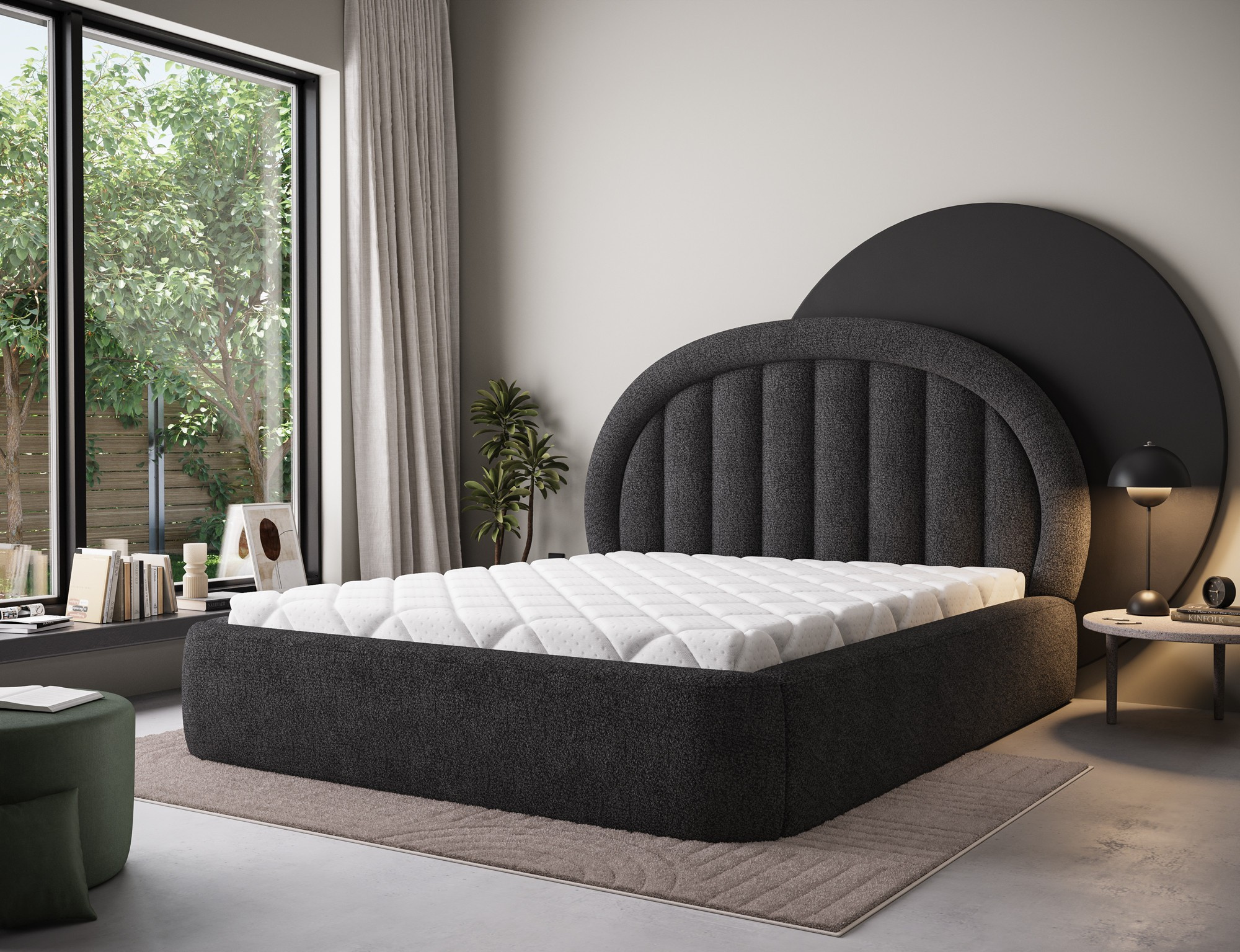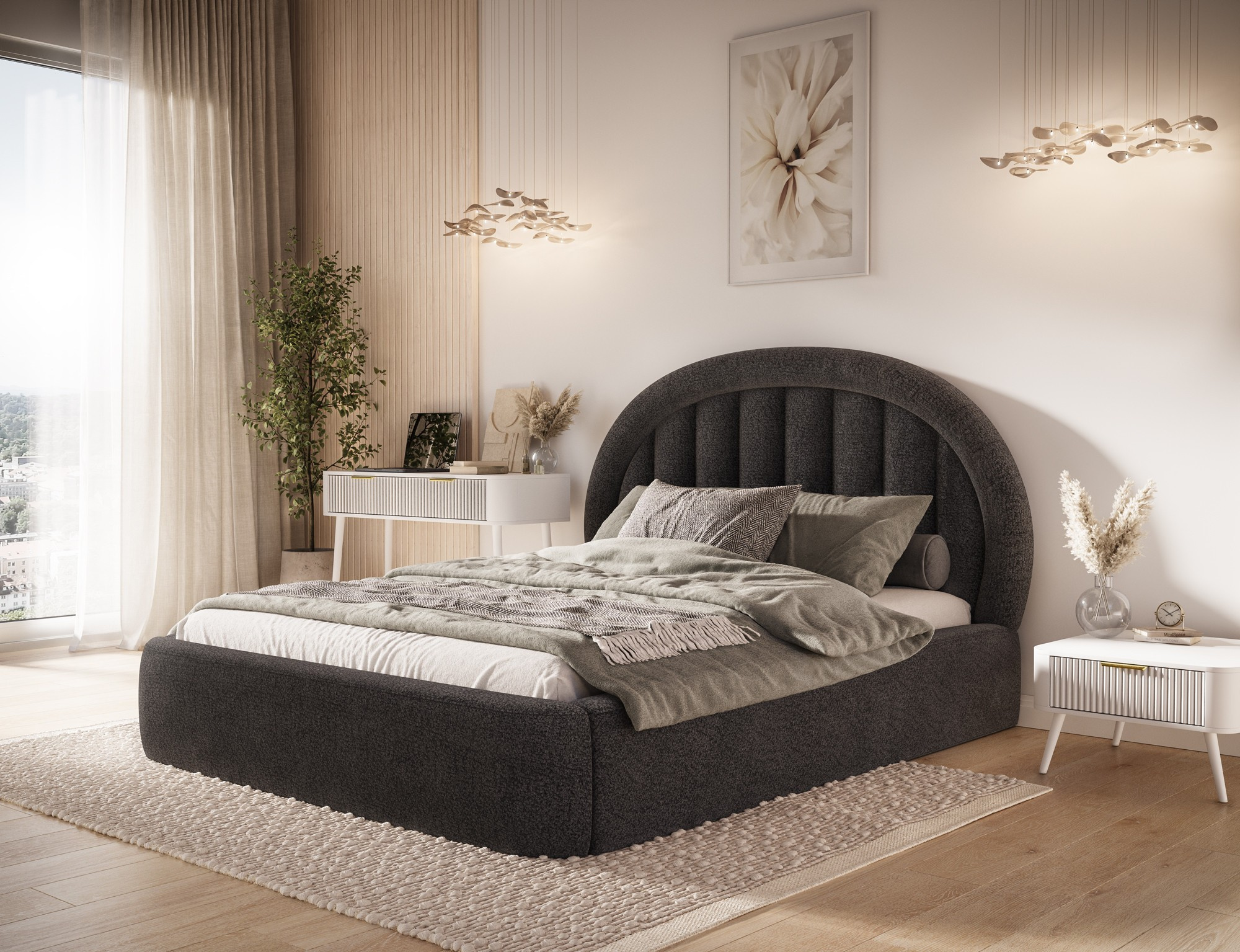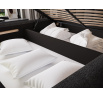The Tapedo bedroom bed combines modern design, functionality, and sleeping comfort. Available in three size variants: 140x200 cm, 160x200 cm, and 180x200 cm, it allows you to adjust the width to your individual needs – 165 cm, 185 cm, or 205 cm respectively. The total height of the bed is 131 cm and the depth is 221 cm, giving the construction an elegant and well-balanced appearance. The filling made of high-quality polyurethane foam T2130 ensures optimal body support and excellent comfort. The Tapedo bed is equipped with a practical bedding storage compartment that makes it easy to keep your bedroom organized. Stable black plastic legs add lightness and a contemporary touch to the design. Thanks to its solid craftsmanship, functional features, and aesthetic form, the Tapedo bed perfectly complements modern interior arrangements, creating an elegant and cozy resting space.