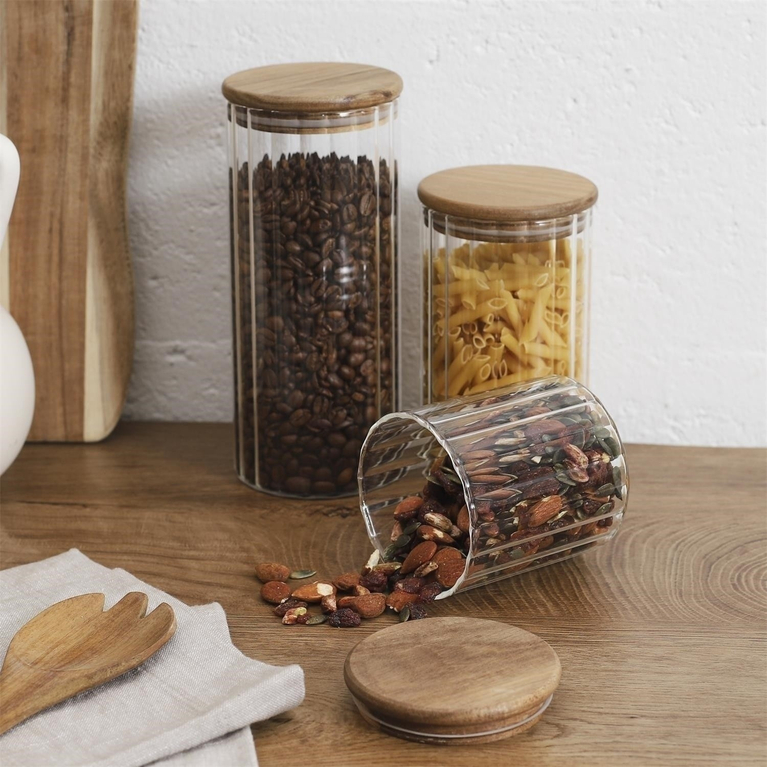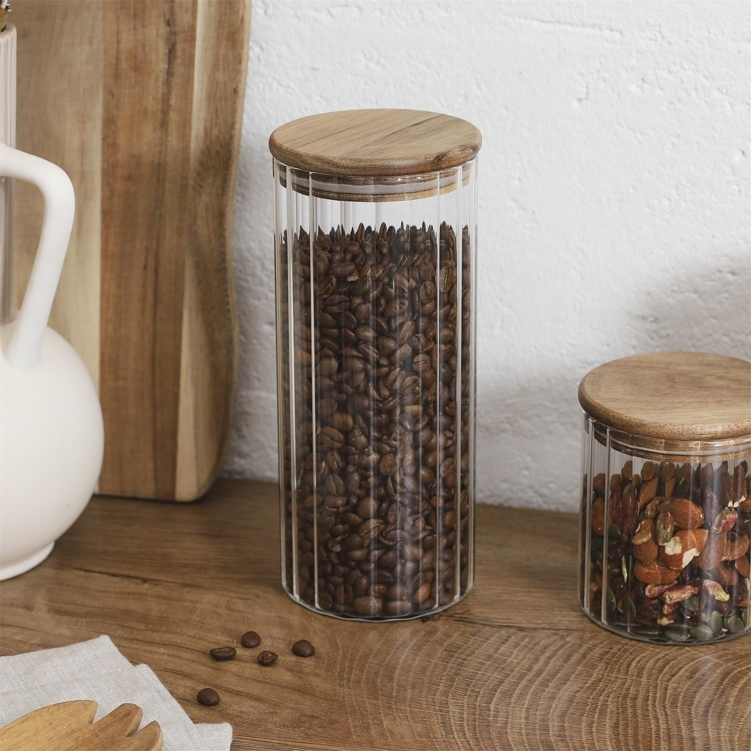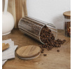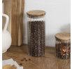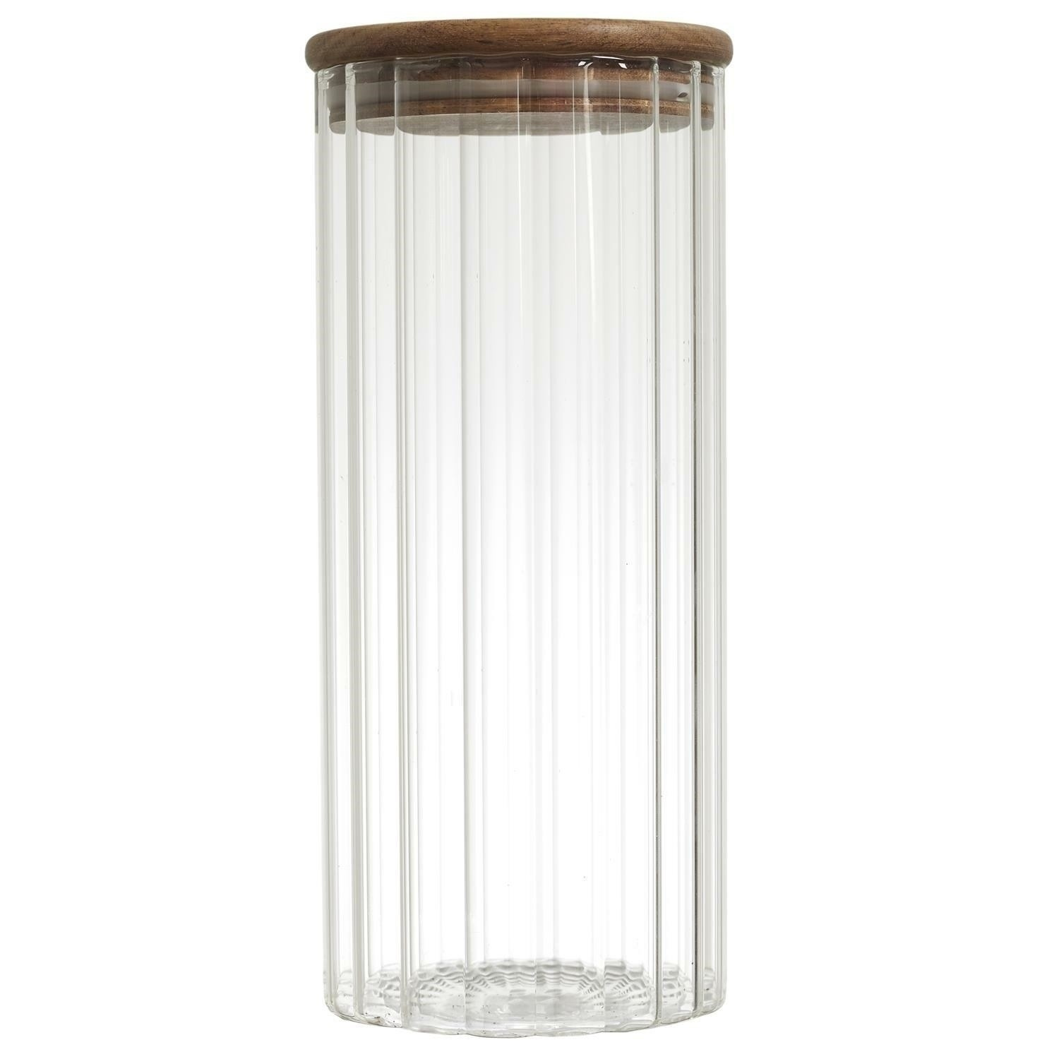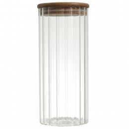 Ez az elegáns, 1,1 literes tárolóüveg ideális megoldás különféle élelmiszerek, fűszerek vagy apró tárgyak tárolására. Akácfából készült szoros fedéllel van ellátva, amely kiváló frissességet és védelmet biztosít a tárolt tartalom számára. A természetes akácfa stílusos megjelenést kölcsönöz a pohárnak, amely illik bármely konyhába. Ideális ömlesztett termékek, például cukor, liszt, kávé vagy fűszerek tárolására, valamint apró tárgyak rendszerezésére a konyhában, kamrában vagy az asztalon. Hosszúság: 9 cm Magasság: 21 cm Mélység: 9 cm Átmérő: 9 cm Súly: 400 gramm Anyag: Üveg, akácfa Érintkezés élelmiszerrel: Igen Mikrohullámú sütőbe tehető: Nem Mosogatógépbe tehető: Nem Mosógépbe tehető: Nem Sütőbe tehető: Nem Fagyasztóba tehető: Nem