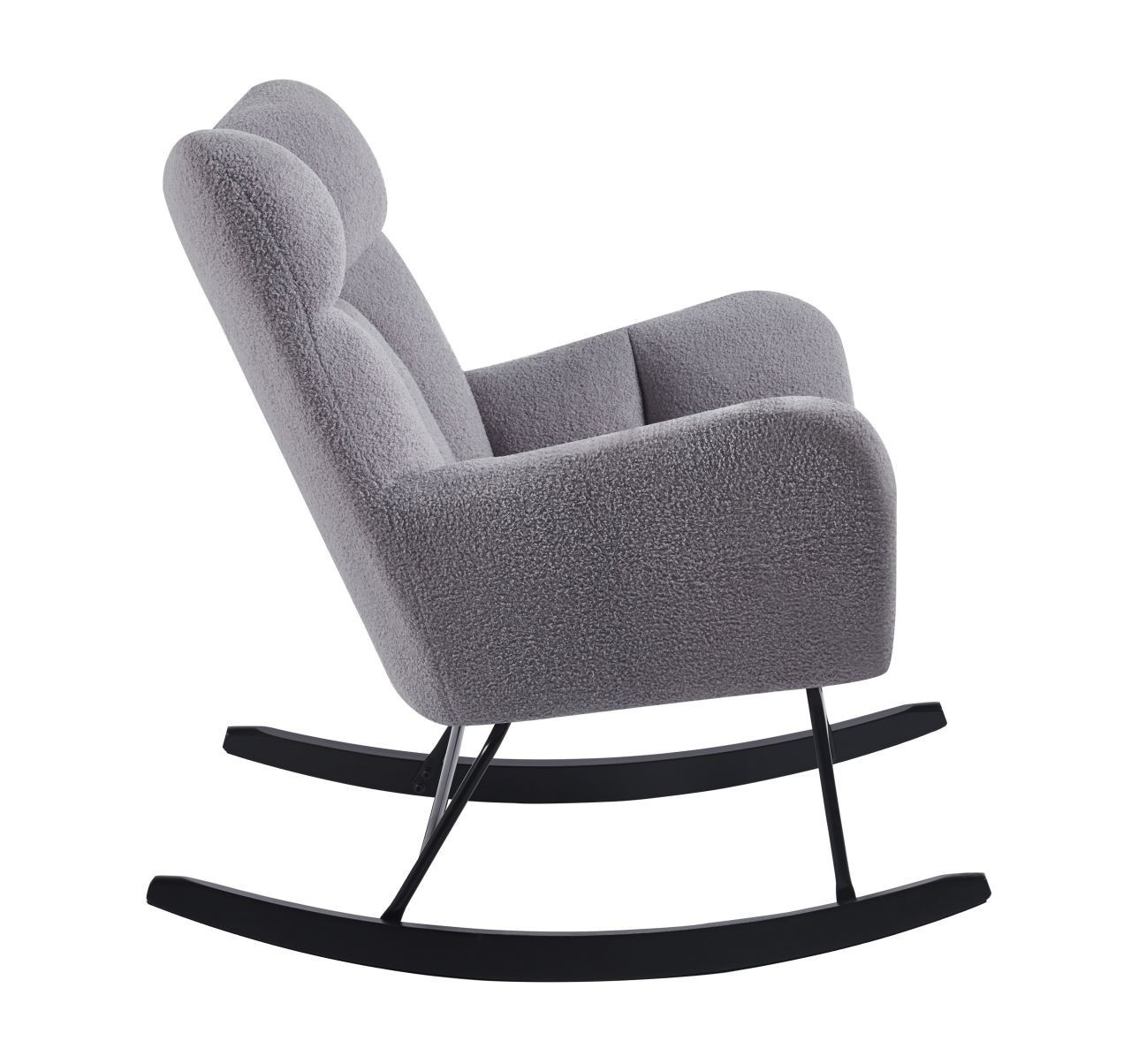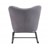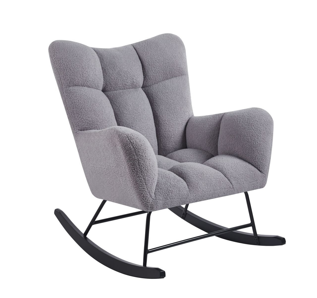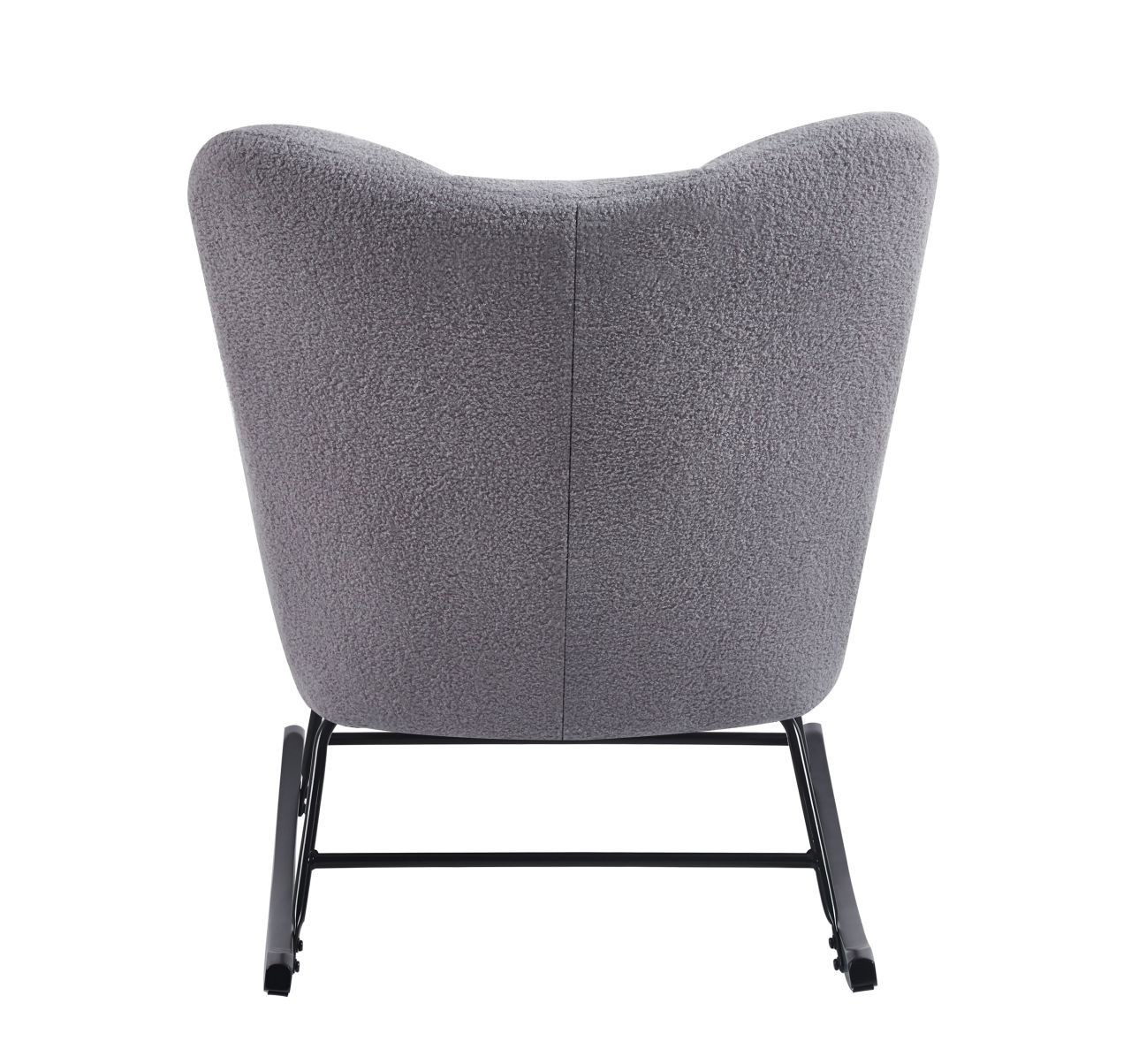 Méretek: - teljes magasság: 96 cm - ülésmagasság: 46 cm - teljes szélesség: 78 cm - teljes mélység: 92 cm Anyag: - ülés: Teddy szövet (Boucle) - keret: porszórt festett fém - talpak: gumifa Szín: - ülés: szürke - keret + talpak: fekete