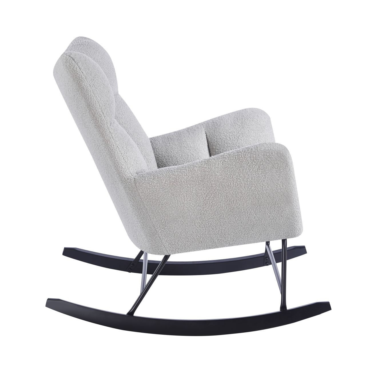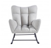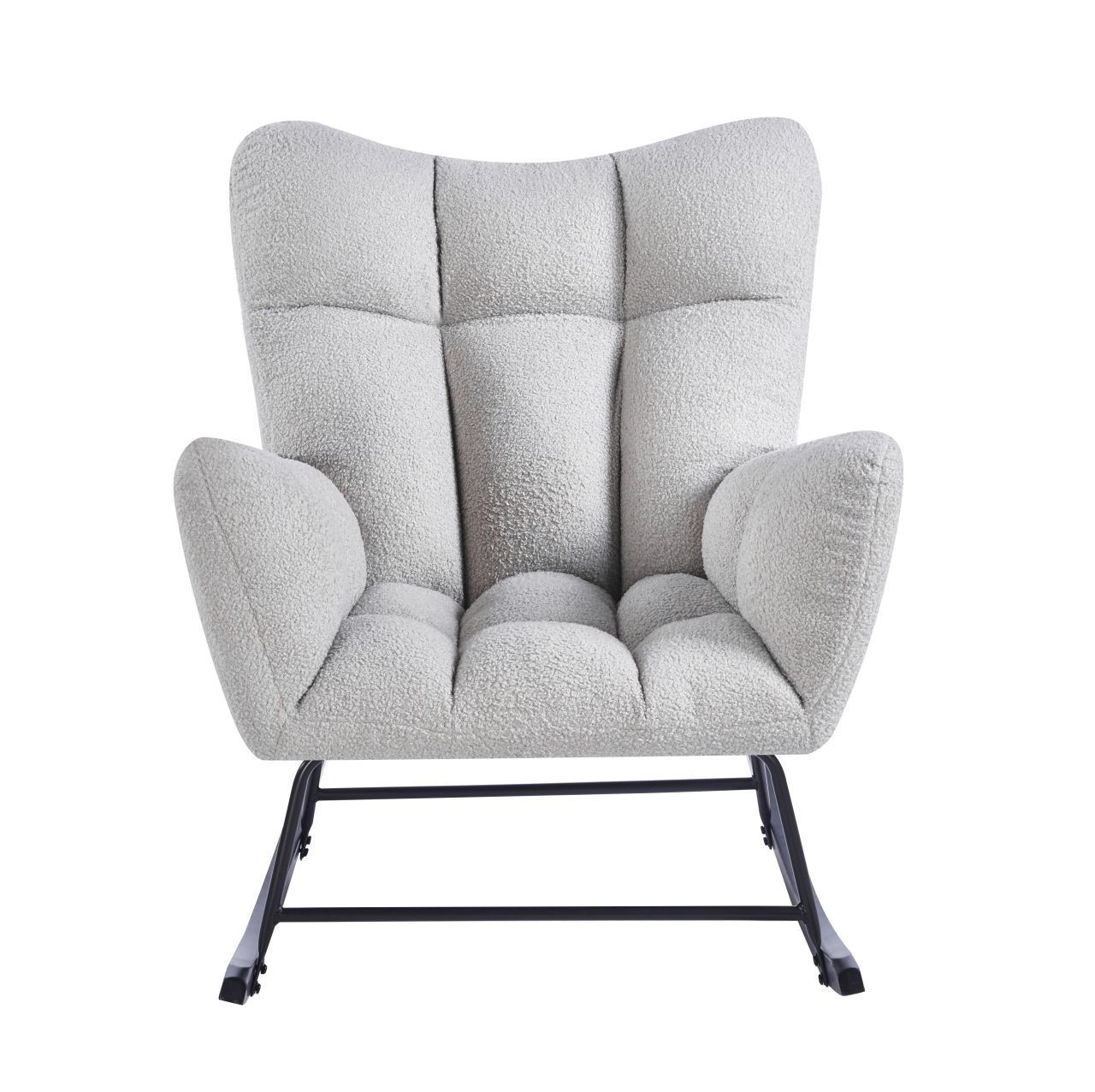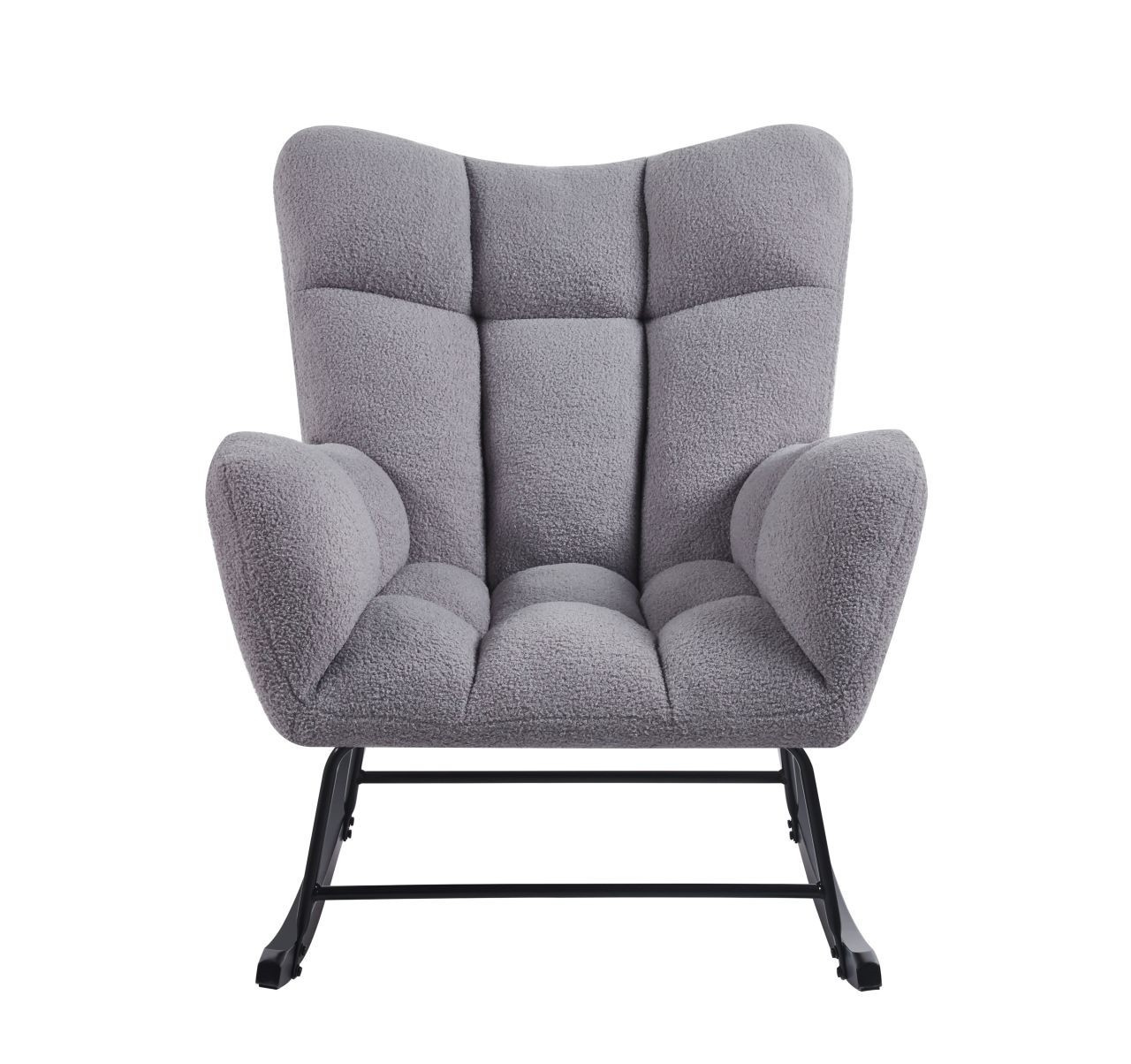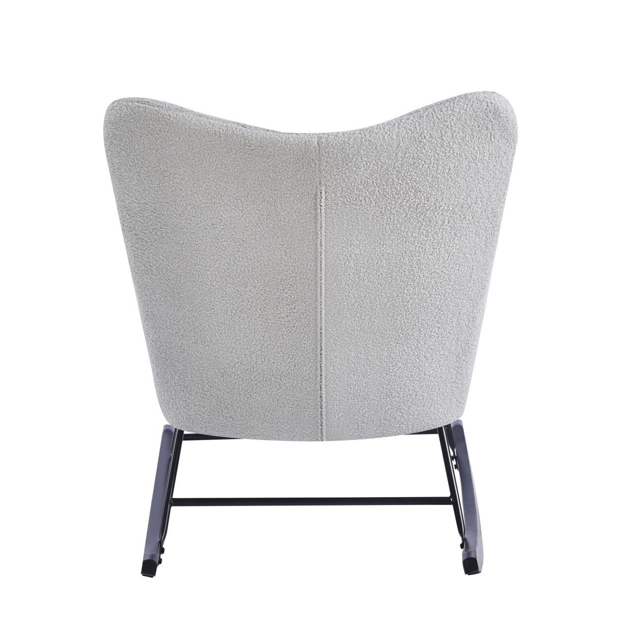 Méretek: - teljes magasság: 96 cm - ülésmagasság: 46 cm - teljes szélesség: 78 cm - teljes mélység: 92 cm Anyag: - ülés: Teddy szövet (Boucle) - keret: porszórt festett fém - talpak: gumifa Szín: - ülés: szürke - keret + talpak: fekete