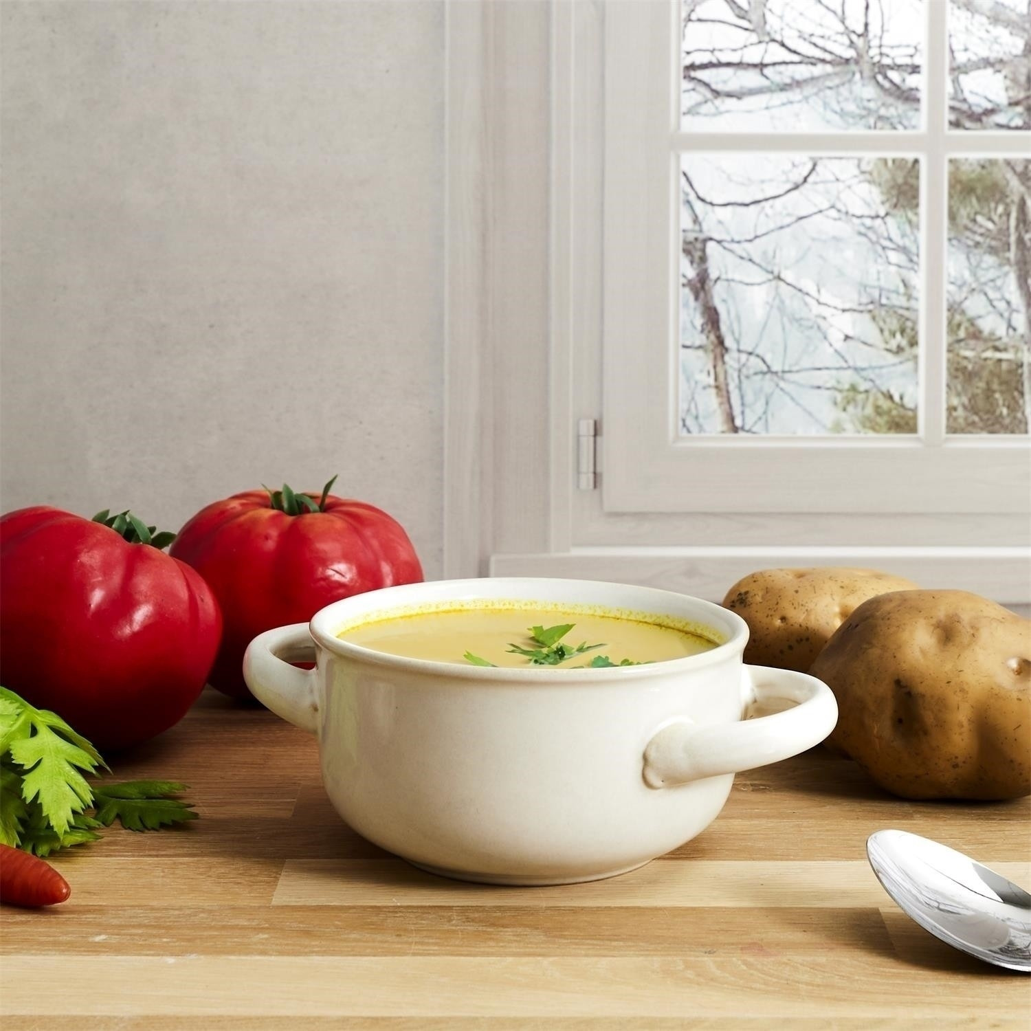 A mázas kerámiából készült levesestál ideális edény a kedvenc forró leveshez. A vastag falaknak és a további fogantyúknak köszönhetően könnyű átadni és áthelyezni a forró leveses tálat. A fül biztosítja, hogy ne égessük meg magunkat a felmelegedett edénnyel. Mosogatógépben mosható. Használható mikrohullámú sütőben