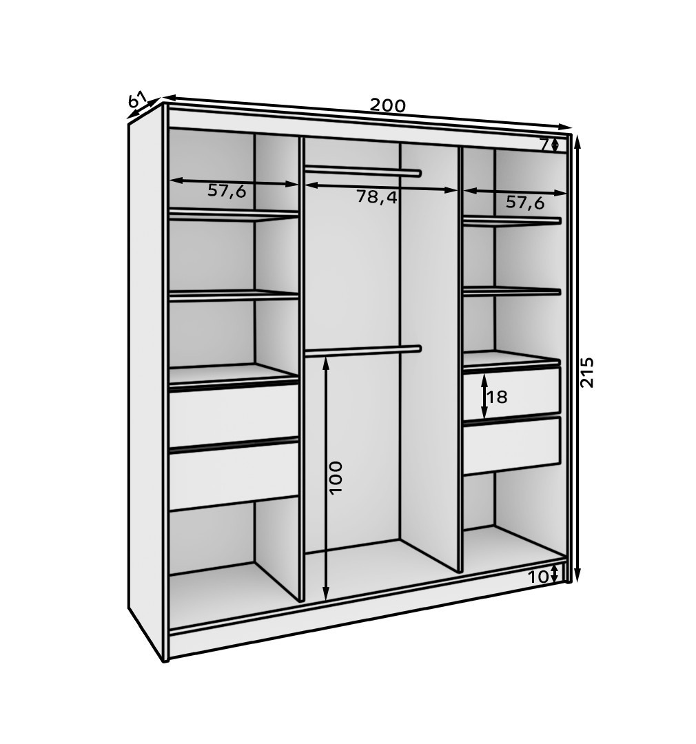 A Tola 200 tolóajtós és tükrös ruhásszekrény ideális megoldás azok számára, akik értékelik a modern dizájn és a praktikusság kombinációját. A 200 cm-es szélességének és tágas kialakításának köszönhetően kivételes kapacitást kínál, amely lehetővé teszi a ruhásszekrény, ágynemű vagy más szükséges tárgyak elrendezését.
