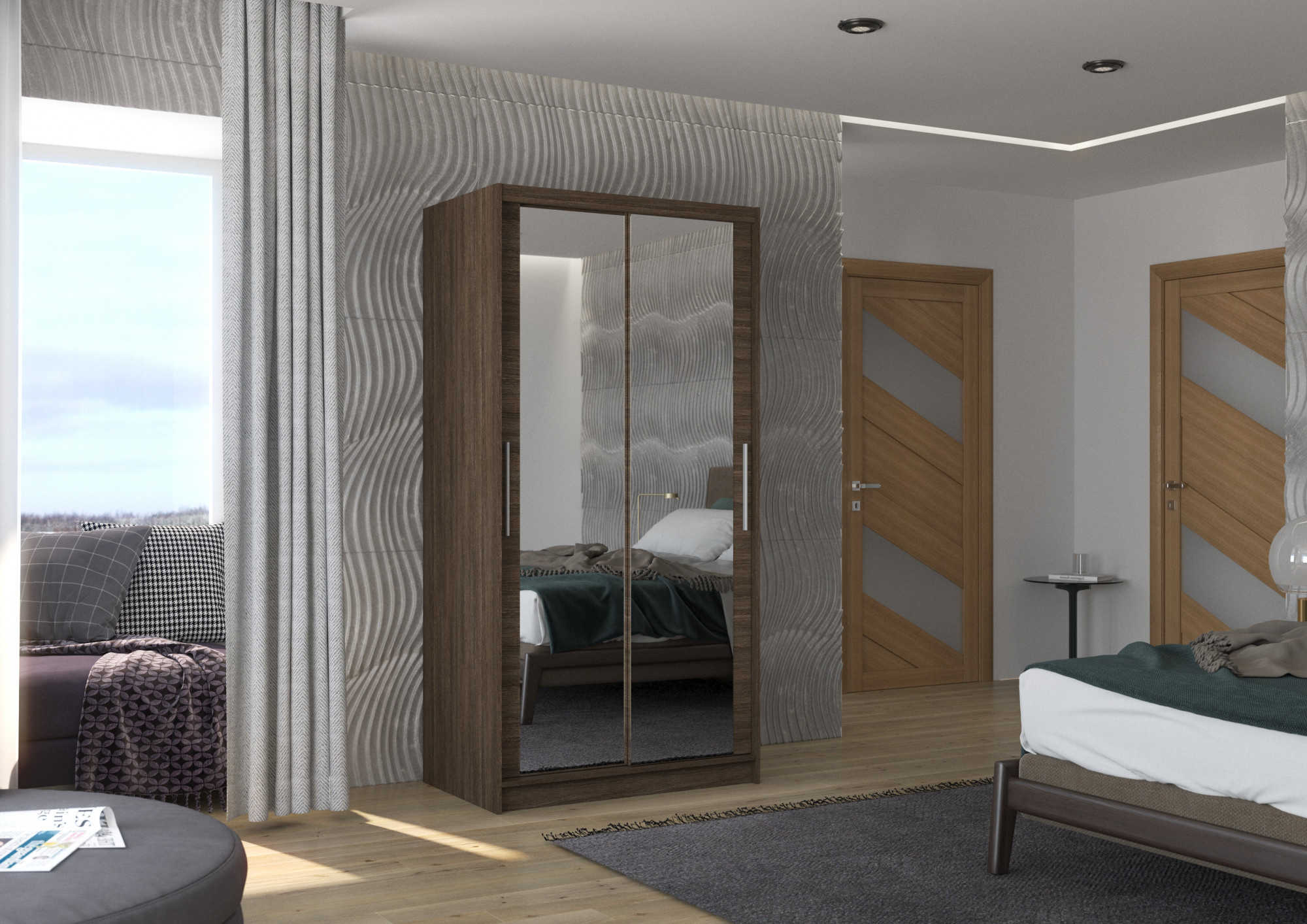 A NEVIO tolóajtós és tükrös ruhásszekrény ideális módja a tér rendezésének. A bútor tágas polcokkal és egy rúddal van felszerelve, amelyre felakaszthatja a ruhákat, öltönyöket, felsőruházatot vagy ingeket. Az elülső oldalra tükröket szereltek, amelyek optikailag növelik a teret. Annak köszönhetően, hogy a szekrény tolóajtós, nem kell további helyet biztosítani az ajtók kinyitásához, ami ideális megoldássá teszi egy kis szoba vagy keskeny előszoba számára.