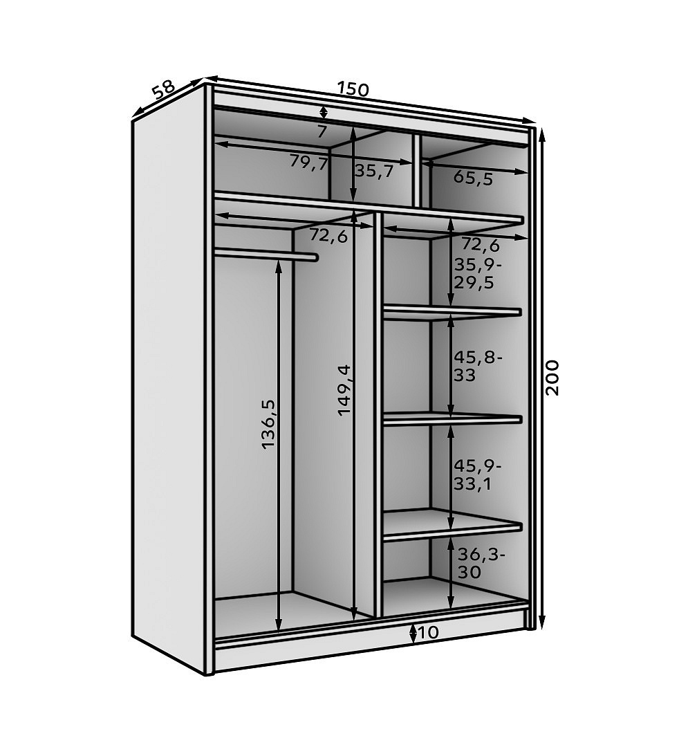 A Calma 150 szekrény ideális megoldást jelentenek a hálószobába, előszobába vagy gardróbba. A tolóajtóknak köszönhetően kényelmes használatot biztosít kisebb helyiségekben is. A modern esztétika biztosítja, hogy harmonikusan illeszkedjen mind a minimalista, mind a klasszikusabb elrendezésekhez.