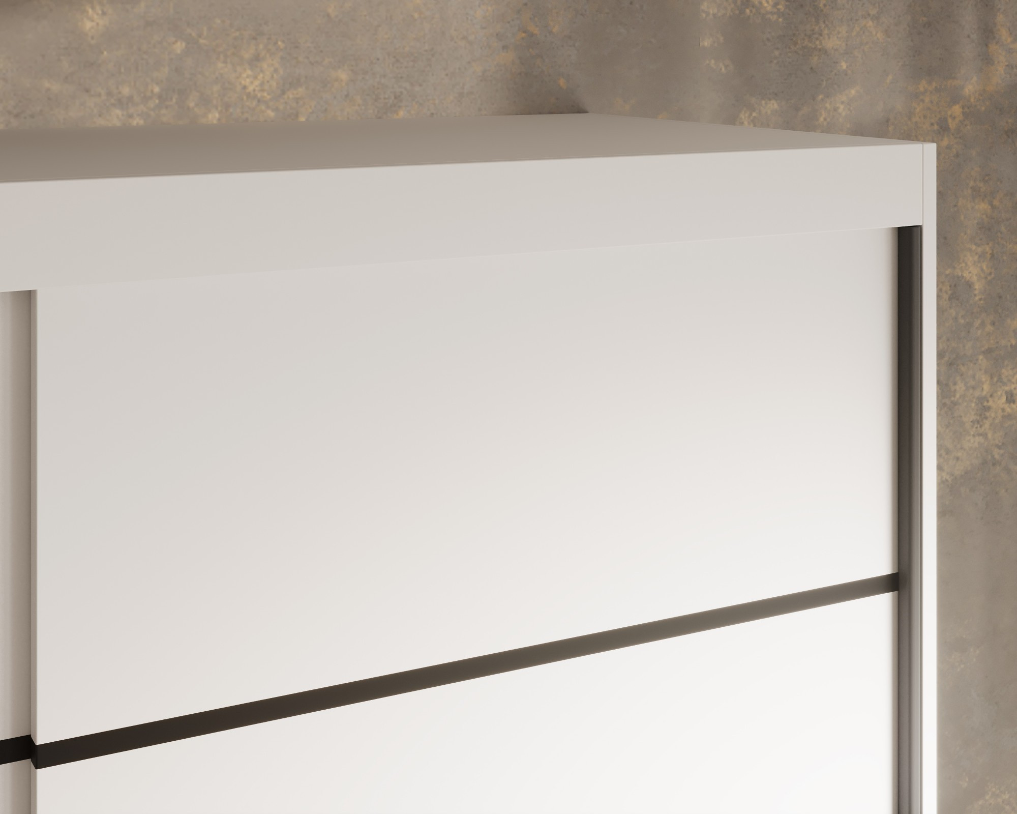 A Cardi 150 tolóajtós ruhásszekrény ideális megoldás azok számára, akik értékelik a stílust, a modernséget és a funkcionalitást. A fehér szerkezet és az elegáns fekete előlap kombinációjának köszönhetően a bútor tökéletesen illeszkedik a modern belső terekbe, különleges jelleget kölcsönözve nekik. A Cardi 150 szekrény ideális választás azok számára, akik értékelik a stílust, a minőséget és a használat kényelmét. Univerzális esztétikája biztosítja, hogy tökéletesen illeszkedjen bármilyen belső térbe, eleganciát és modern jelleget kölcsönözve neki.