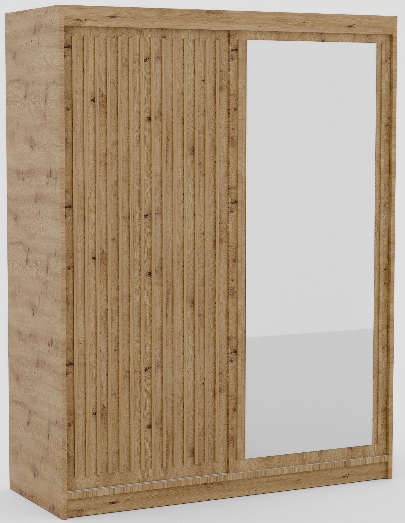 A Delia tolóajtós szekrény fa színű lamellákkal stílusos és praktikus megoldást kínál ruhák és egyéb tárgyak tárolására otthonában.