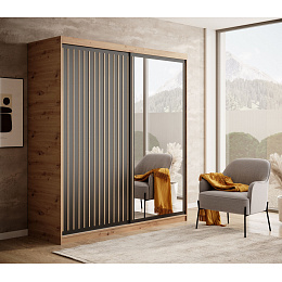 A Delia tolóajtós szekrény fa színű lamellákkal stílusos és praktikus megoldást kínál ruhák és egyéb tárgyak tárolására otthonában.