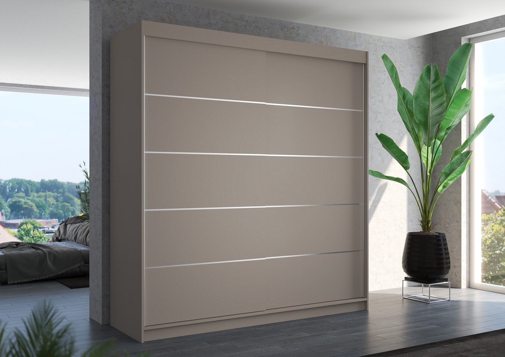 Az ESTEVA tolóajtós ruhásszekrény ideális módja a tér rendezésének. A bútor tágas polcokkal és egy rúddal van felszerelve, amelyre felakaszthatja a ruhákat, öltönyöket, felsőruházatot vagy ingeket. Az elülső oldalon díszes, ezüst színű vízszintes csíkok találhatók, amelyek különleges stílust kölcsönöznek a bútornak. Annak köszönhetően, hogy a szekrény tolóajtós, nem kell további helyet biztosítani az ajtók kinyitásához, ami ideális megoldássá teszi egy kis szoba vagy keskeny előszoba számára.