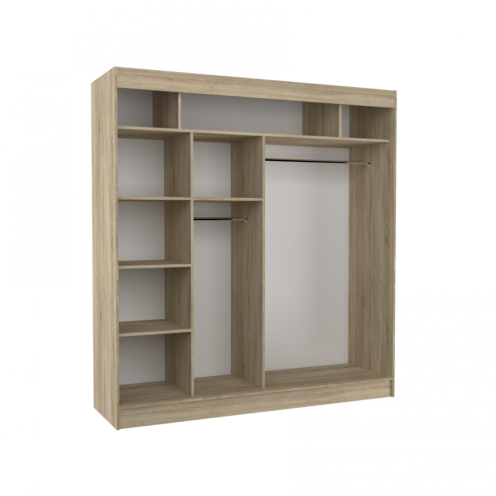 A tolóajtós BATIA szekrény ideális módja a tér rendezésének. A bútor tágas polcokkal és egy rúddal van felszerelve, amelyre felakaszthatja a ruhákat, öltönyöket, felsőruházatot vagy ingeket. Az elülső oldalon díszes lacobelek találhatók, amelyek kivételes stílust kölcsönöznek a bútornak. Annak köszönhetően, hogy a szekrény tolóajtós, nem kell további helyet biztosítani az ajtók kinyitásához, ami ideális megoldássá teszi egy kis szoba vagy keskeny előszoba számára.