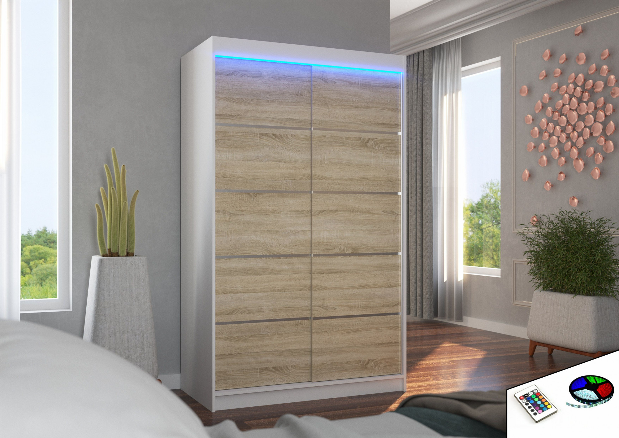 Tolóajtós szekrény LED világítással BENISSO 120 Fehér+Sonoma