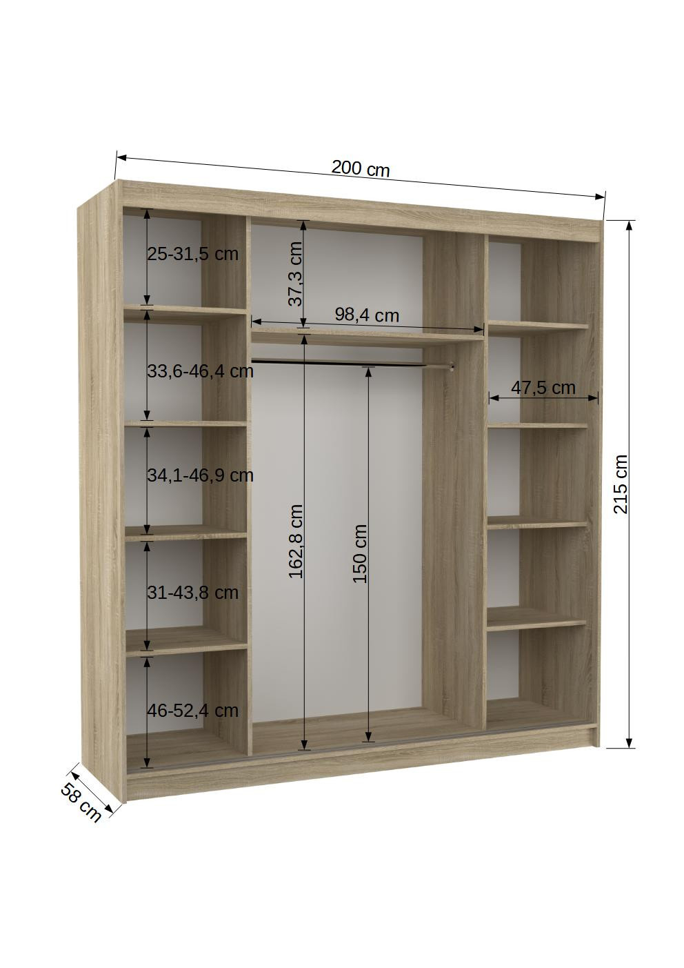 A MEGAN ruhásszekrény ideális módja a tér rendezésének. A bútor tágas polcokkal és egy rúddal van felszerelve, amelyre felakaszthatja a ruhákat, öltönyöket, felsőruházatot vagy ingeket. Annak köszönhetően, hogy a szekrény tolóajtós, nem kell további helyet biztosítani az ajtók kinyitásához, ami ideális megoldássá teszi egy kis szoba vagy keskeny előszoba számára.