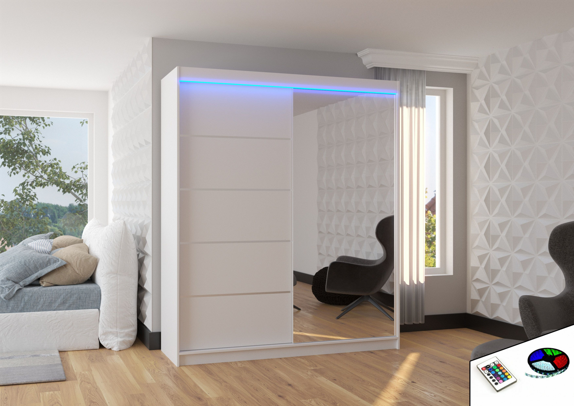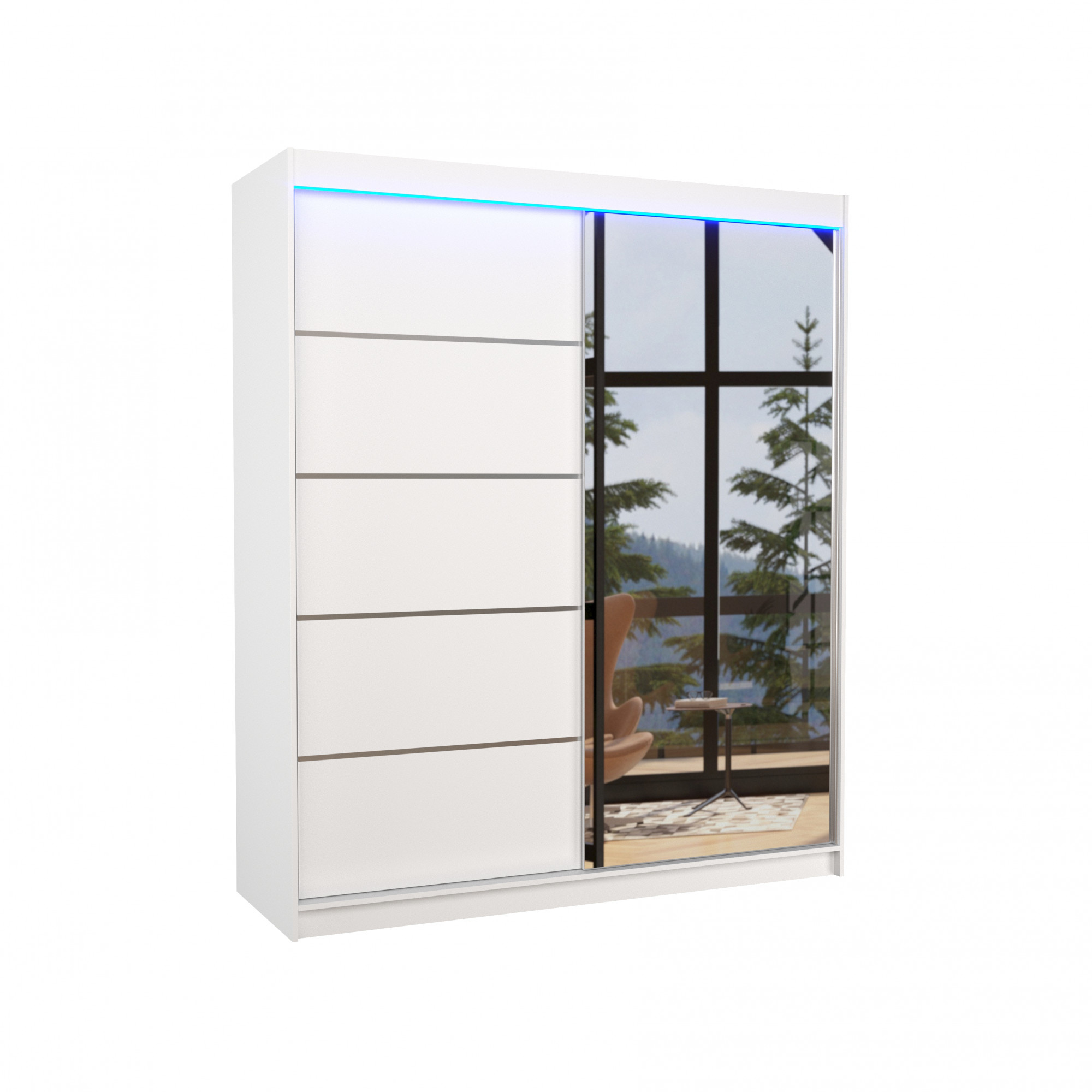 Tolóajtós szekrény tükörrel és LED világítással CARO 180 Fehér+Fehér
